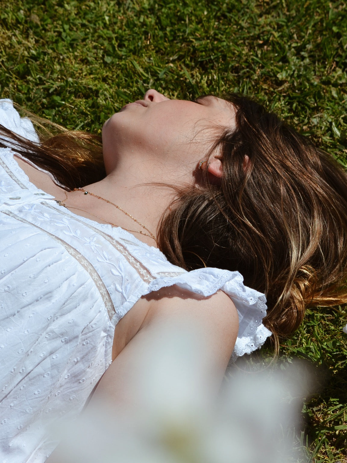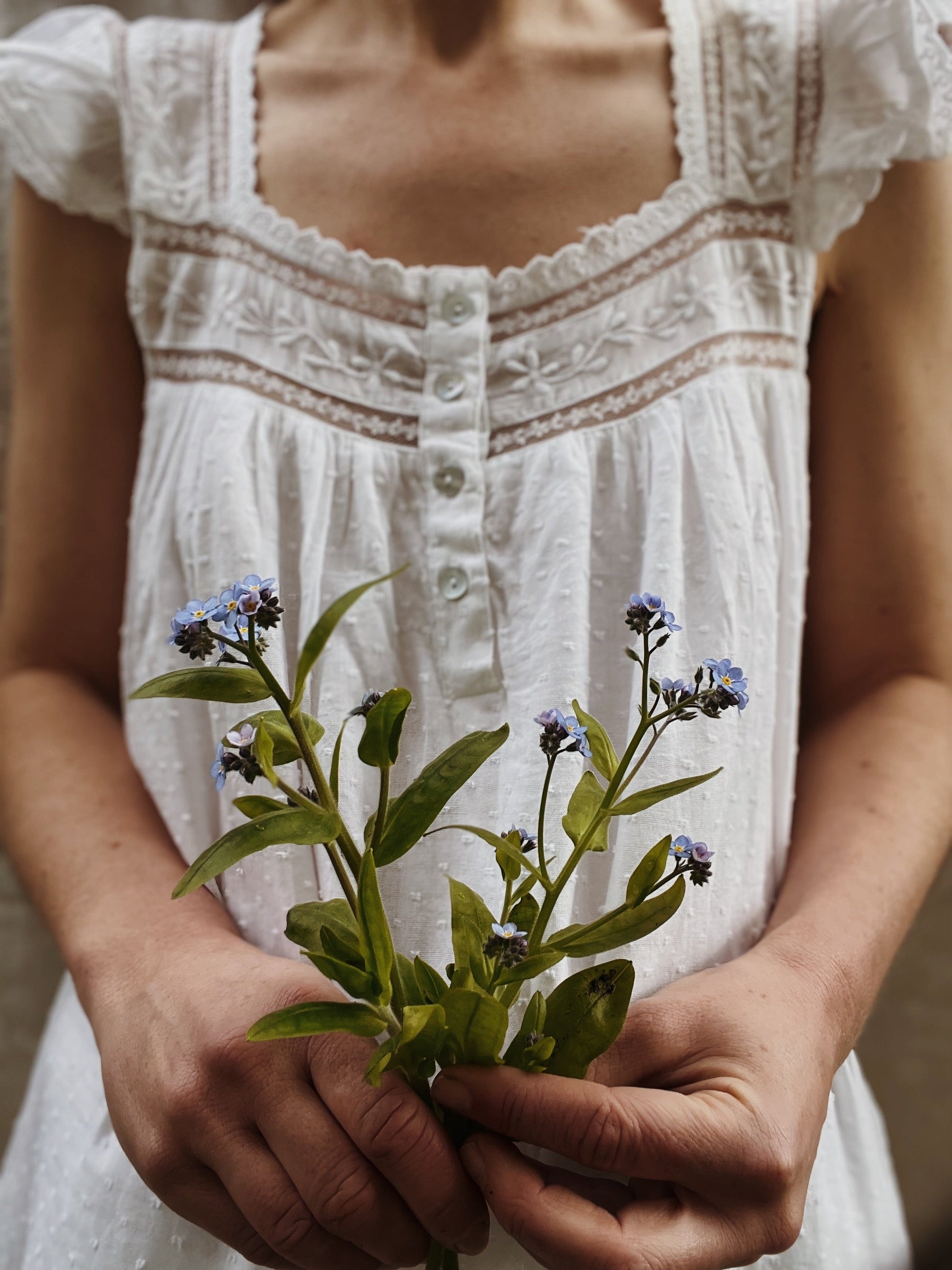 Gathered cap sleeves are a feature along with intricate lace detailing and embroidery which is a beautifully slow and time consuming process. Perfectly dreamy for pottering around on warm days, out to lunch, or even for sleep.