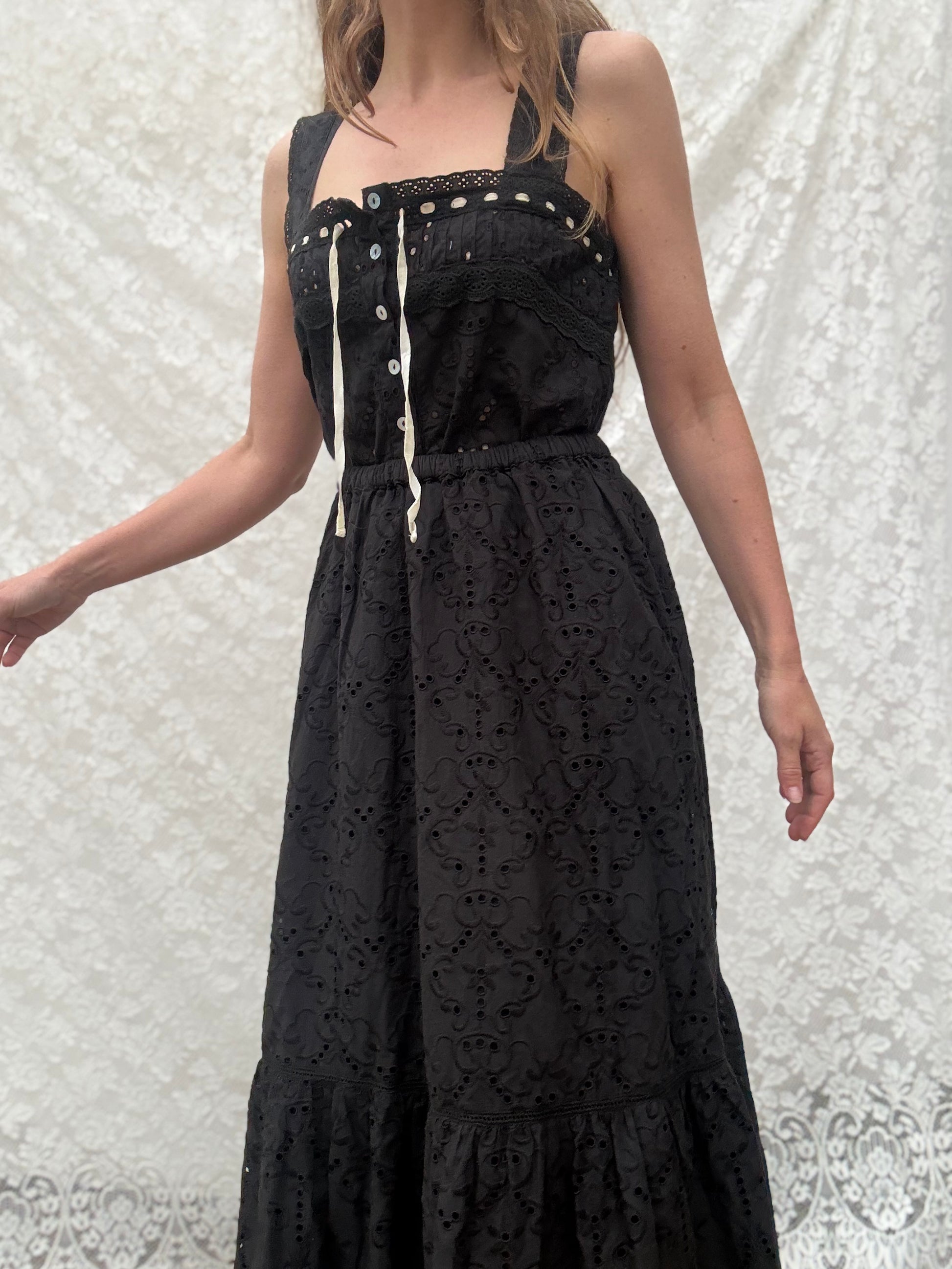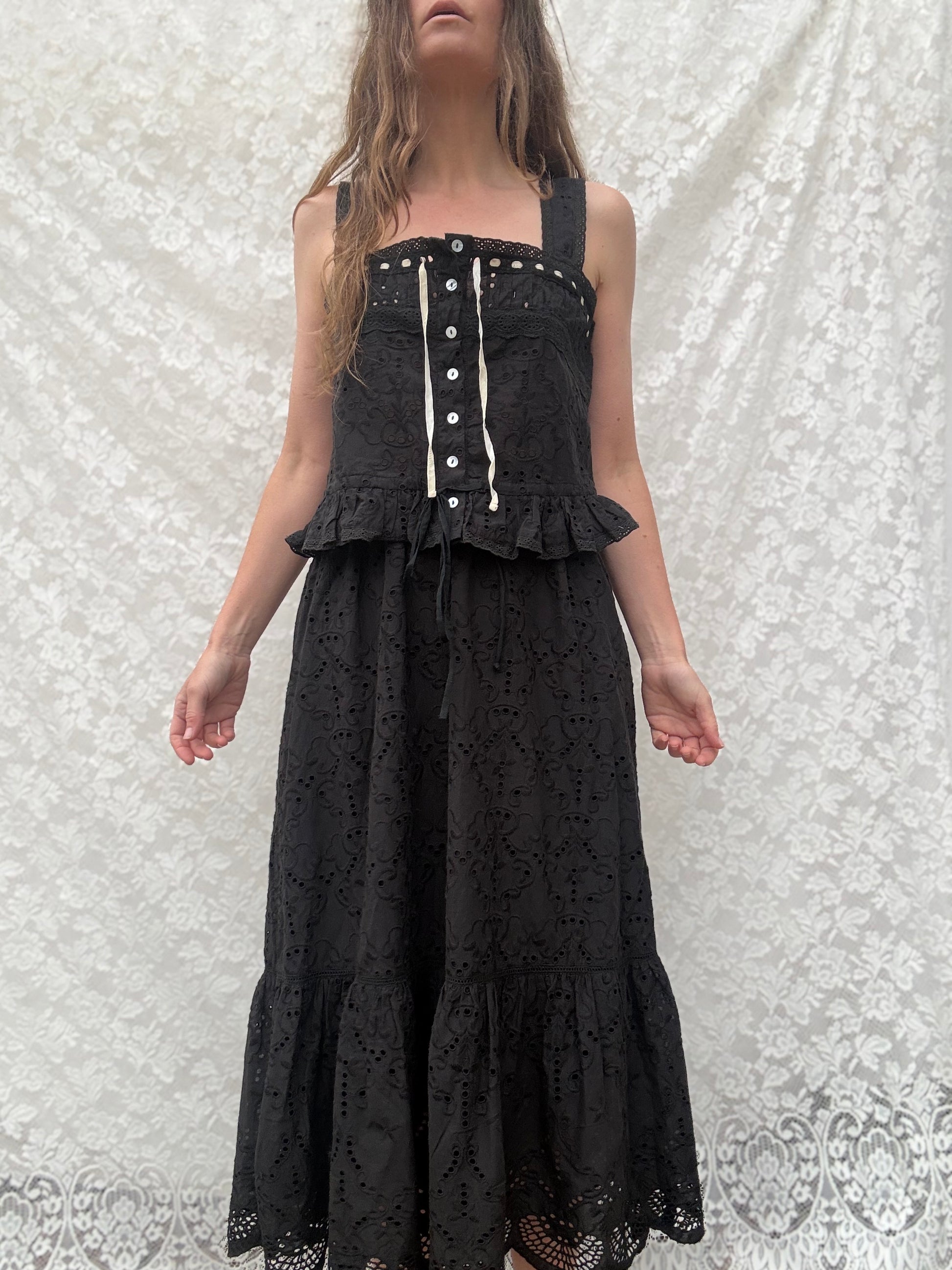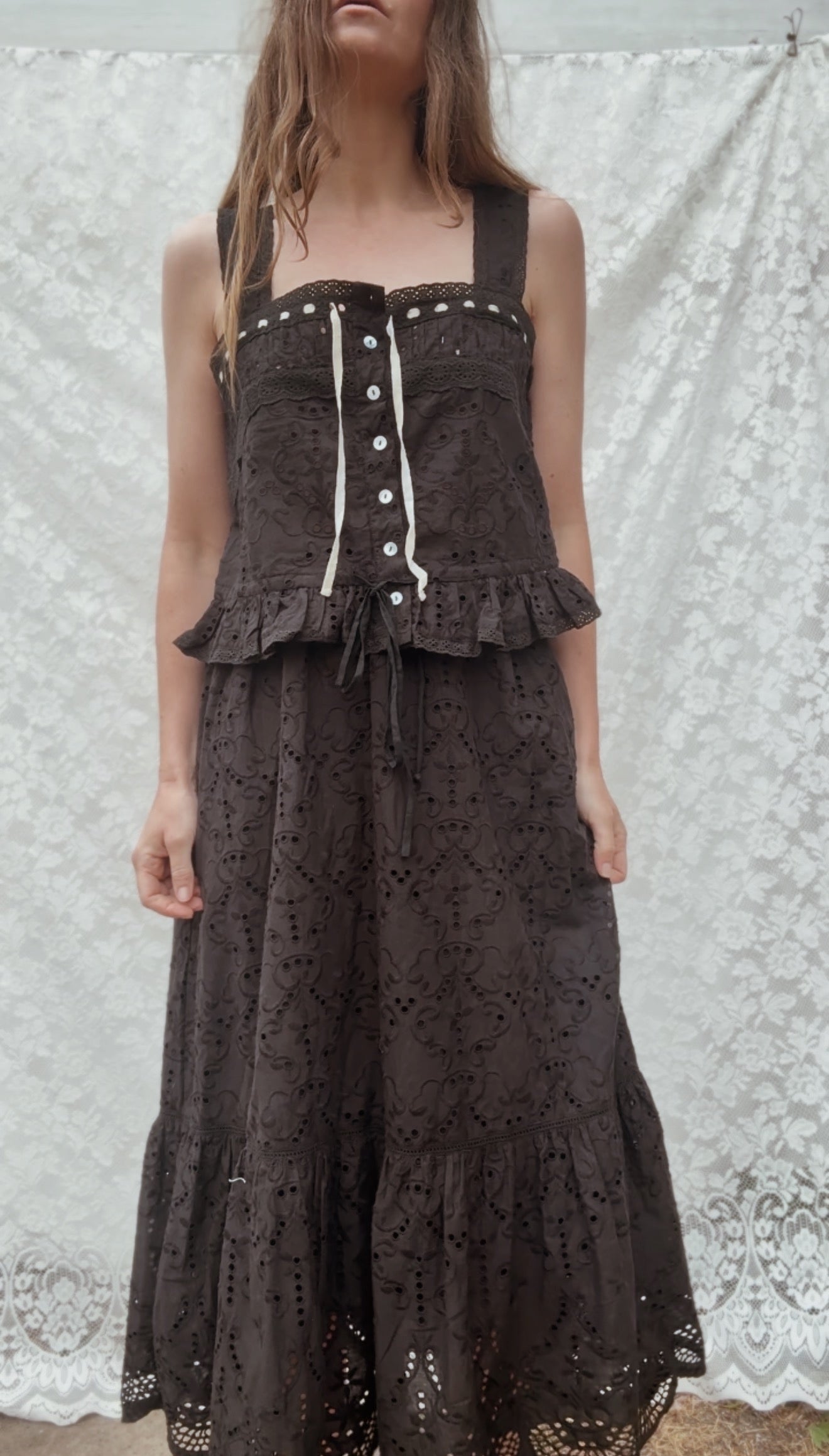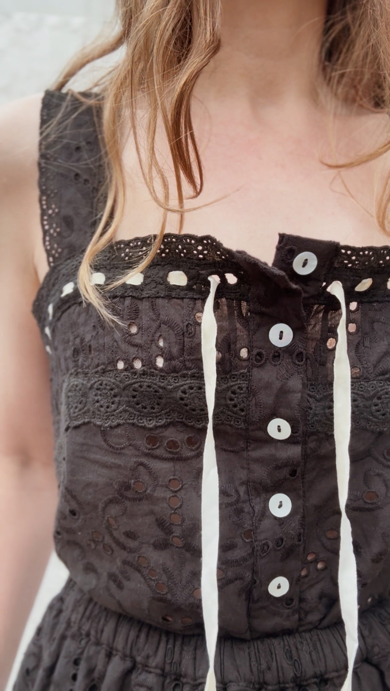 A dream to wear, a soft and feminine silhouette featuring intricate cutwork detailing, pintucks and a velvet ribbon trim.