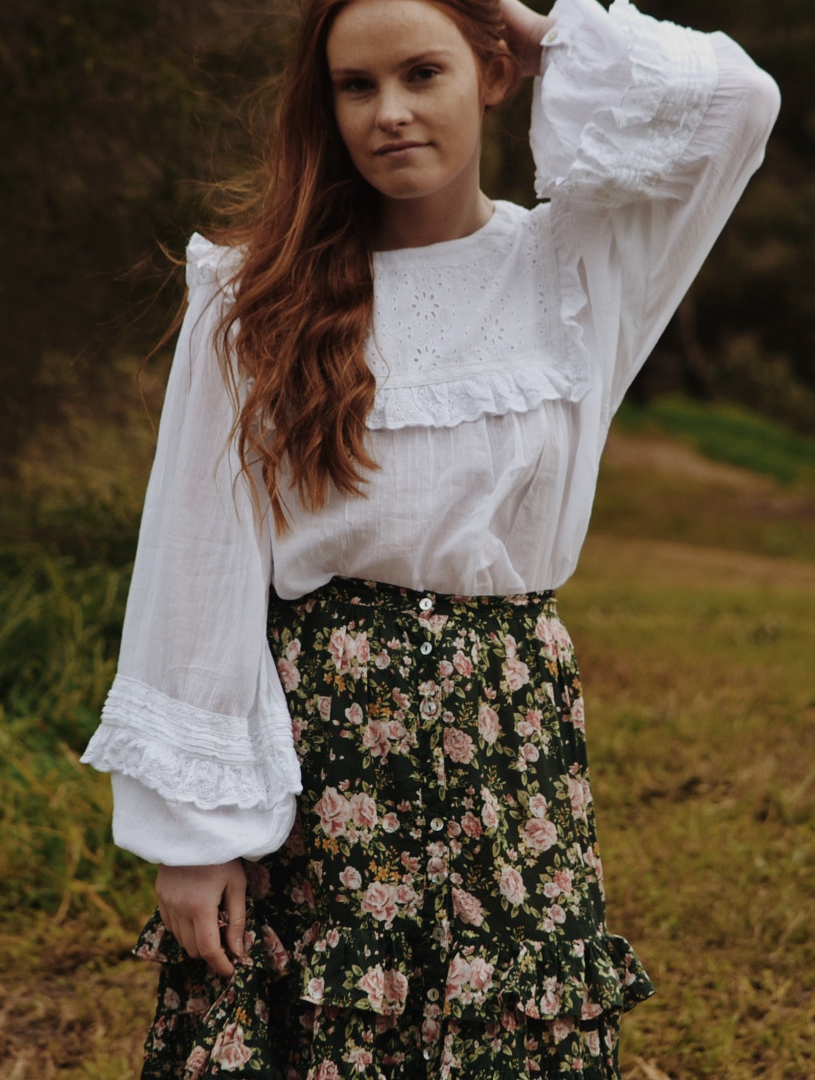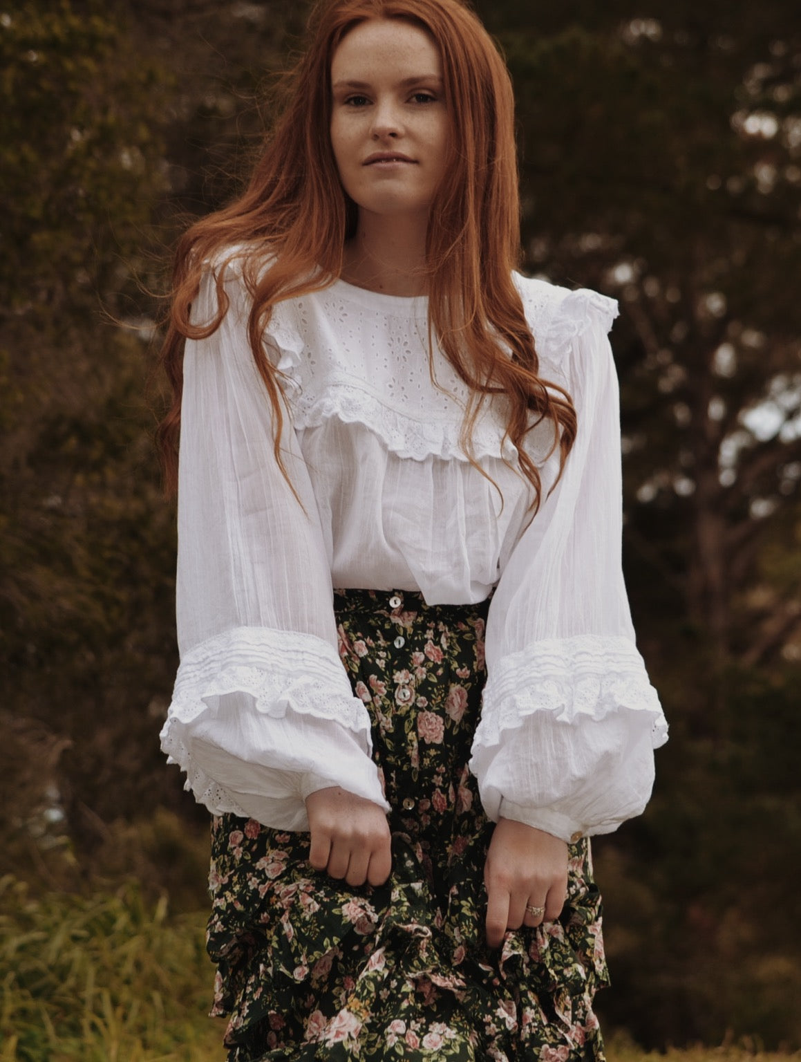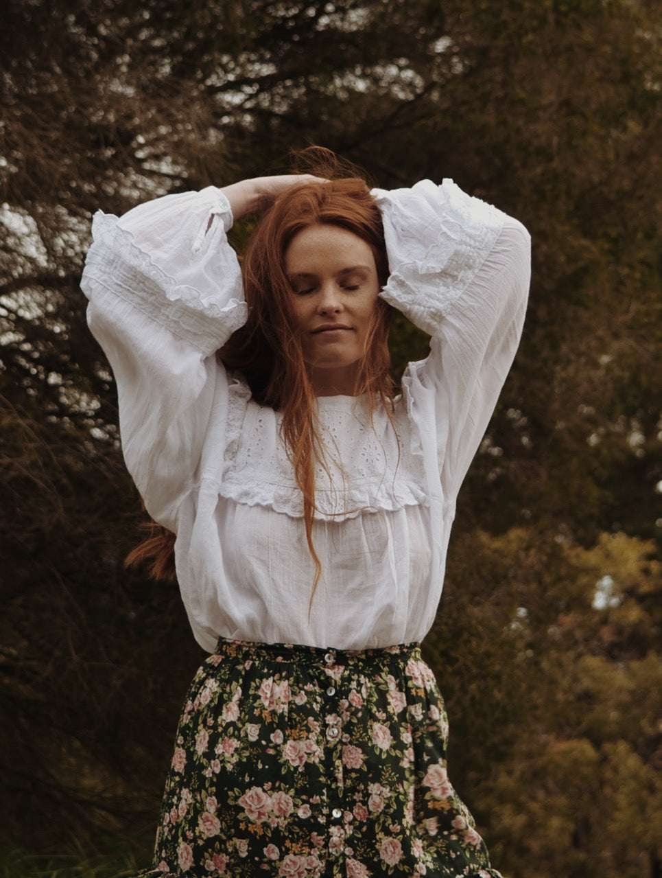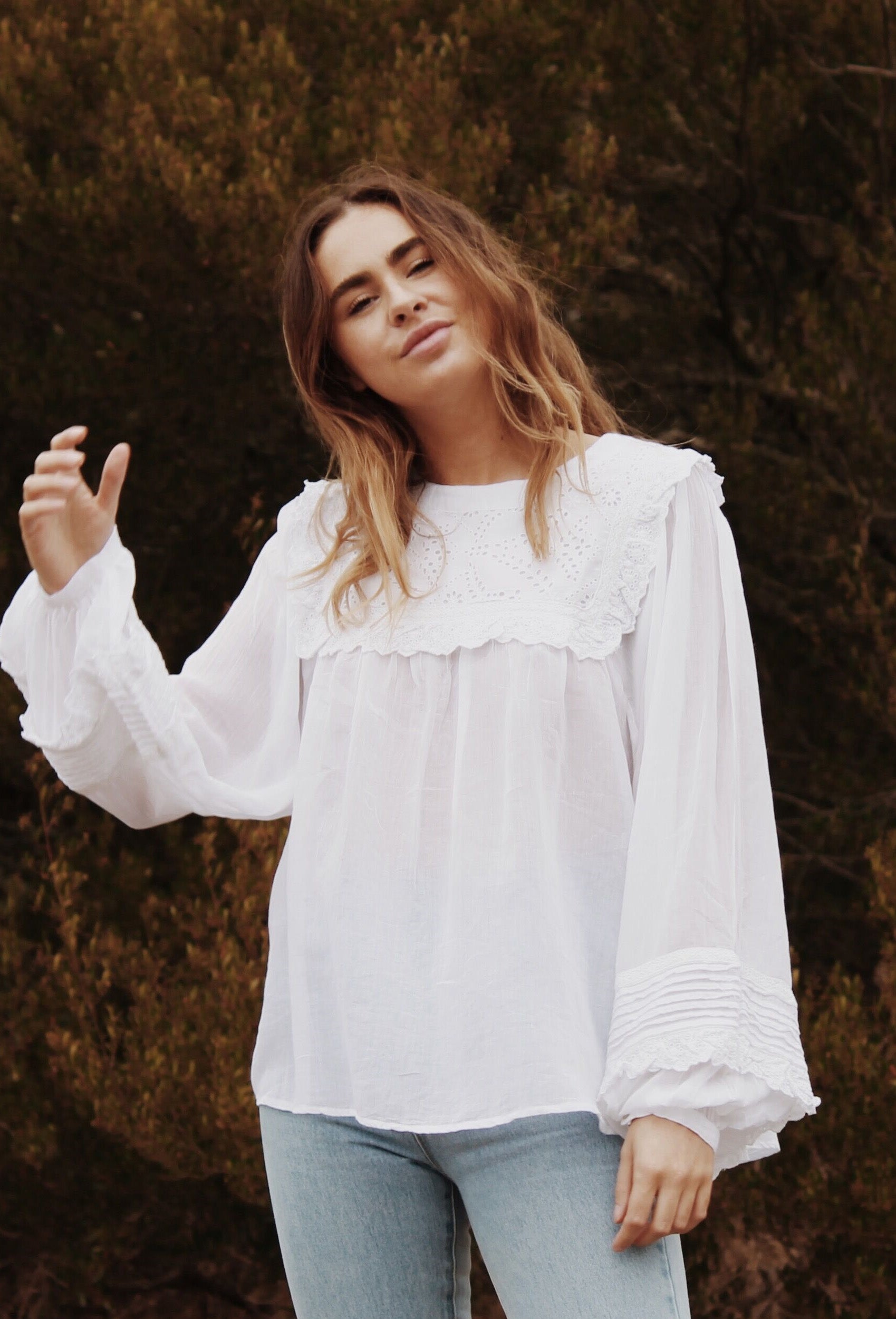 100% cotton. The dreamiest of blouses, made in super soft, lightweight cotton gauze. Beautifully flowy with billowing sleeves, wear loose or tucked in to add shape. Featuring a frilled, embroidered cotton yoke with detailing on the sleeve. This blouse is so soft and feminine, perfect for garden wandering and daydreaming.