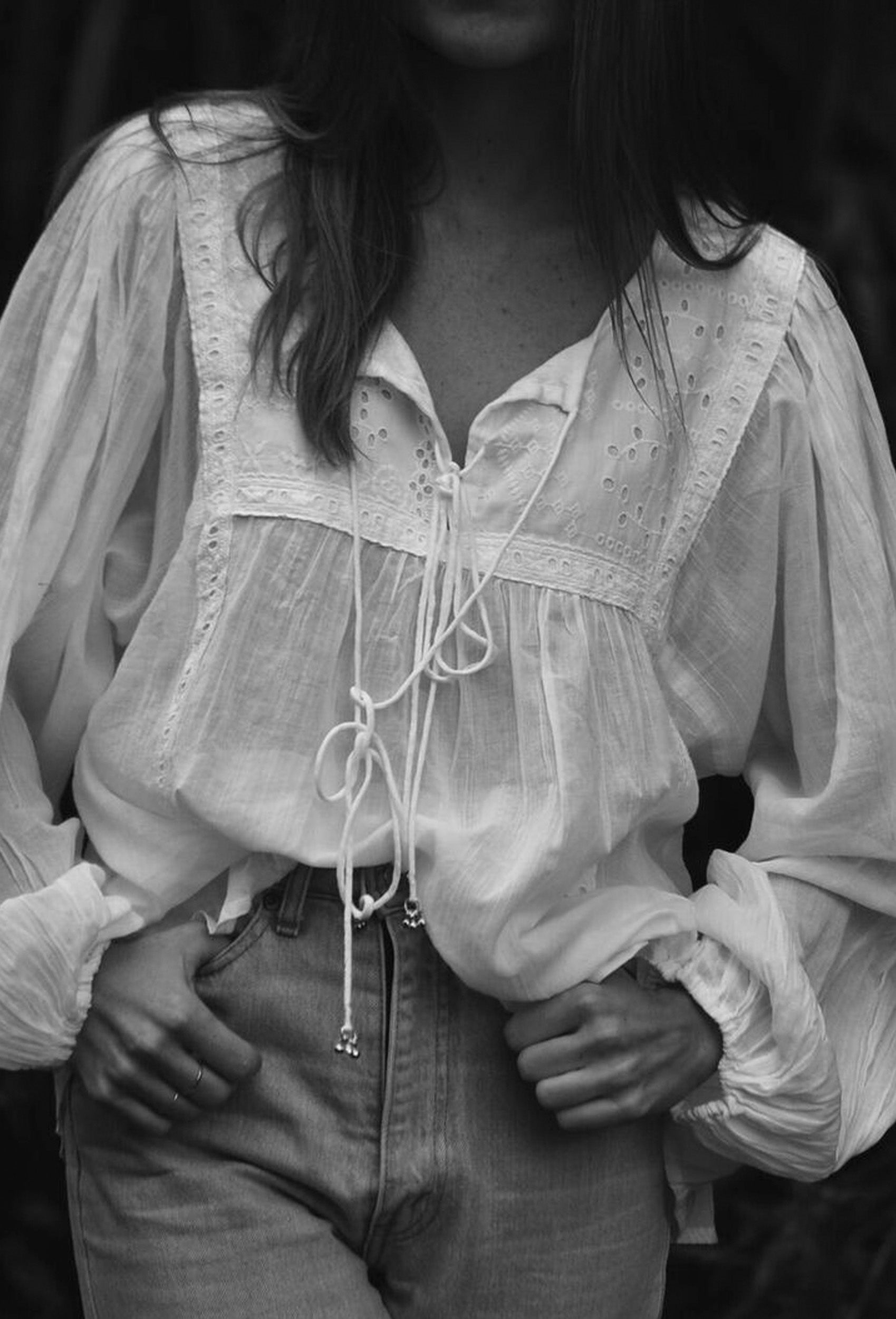 100% Cotton. The ultimate bohemian luxe blouse, this beauty will be a wardrobe staple. Beautifully flowy with billowing sleeves, wear loose or tucked in to add shape. Made in the super soft cotton gauze with French inspired lace panelling in an open pinafore style, great if you are breastfeeding. This blouse is just as perfect for playing on the floor with children as it is for lunch with the girls.