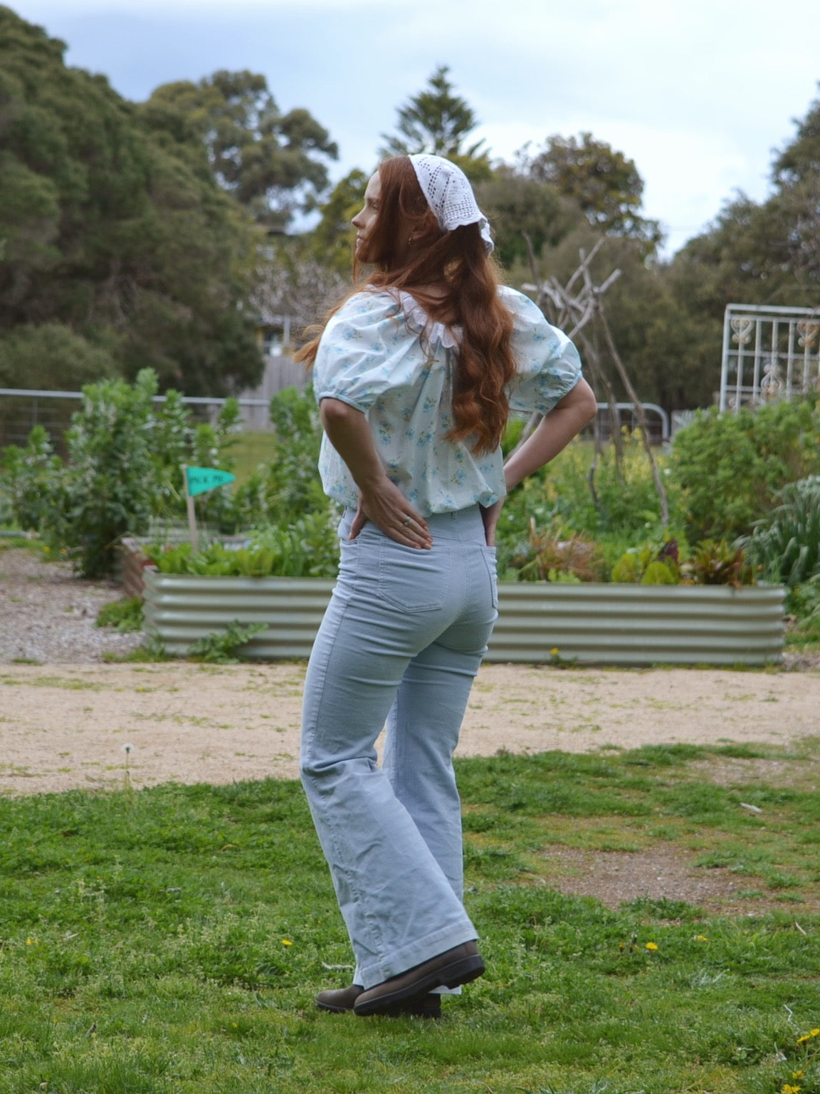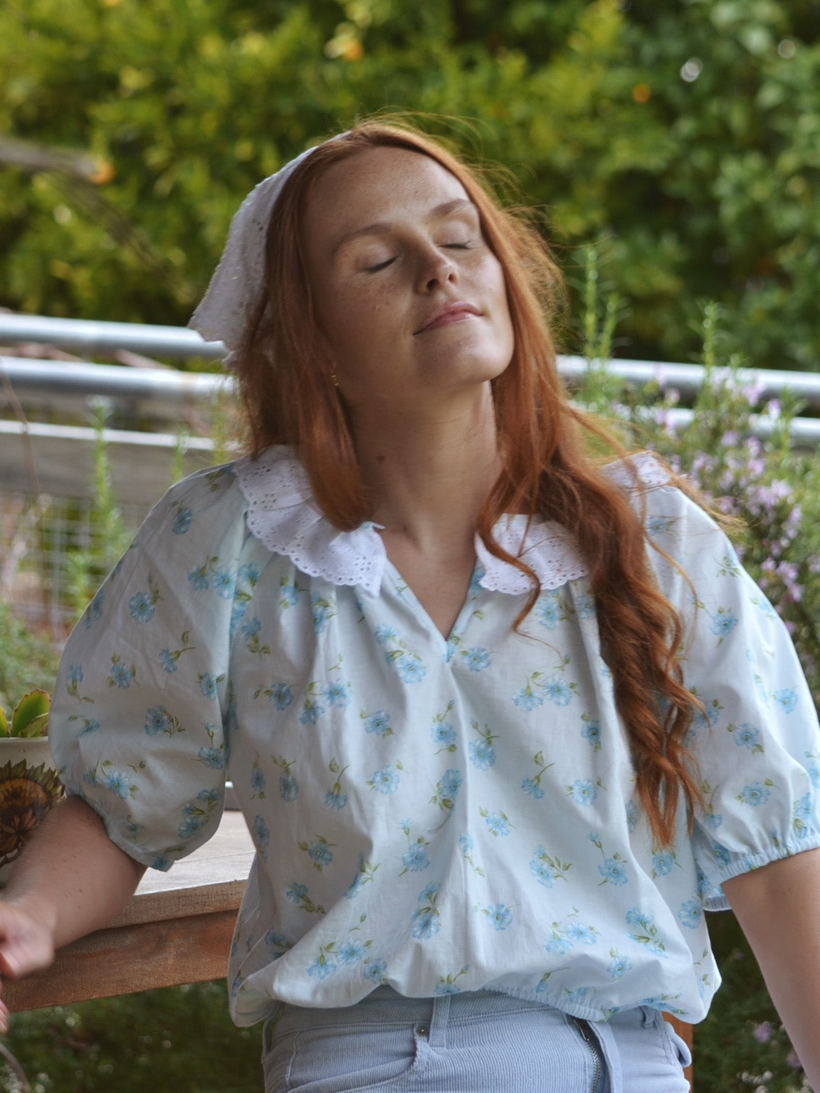 REWORKED - ONE OF A KIND SMOCK CROP BLOUSE BLUE FLORAL EXTRA SMALL