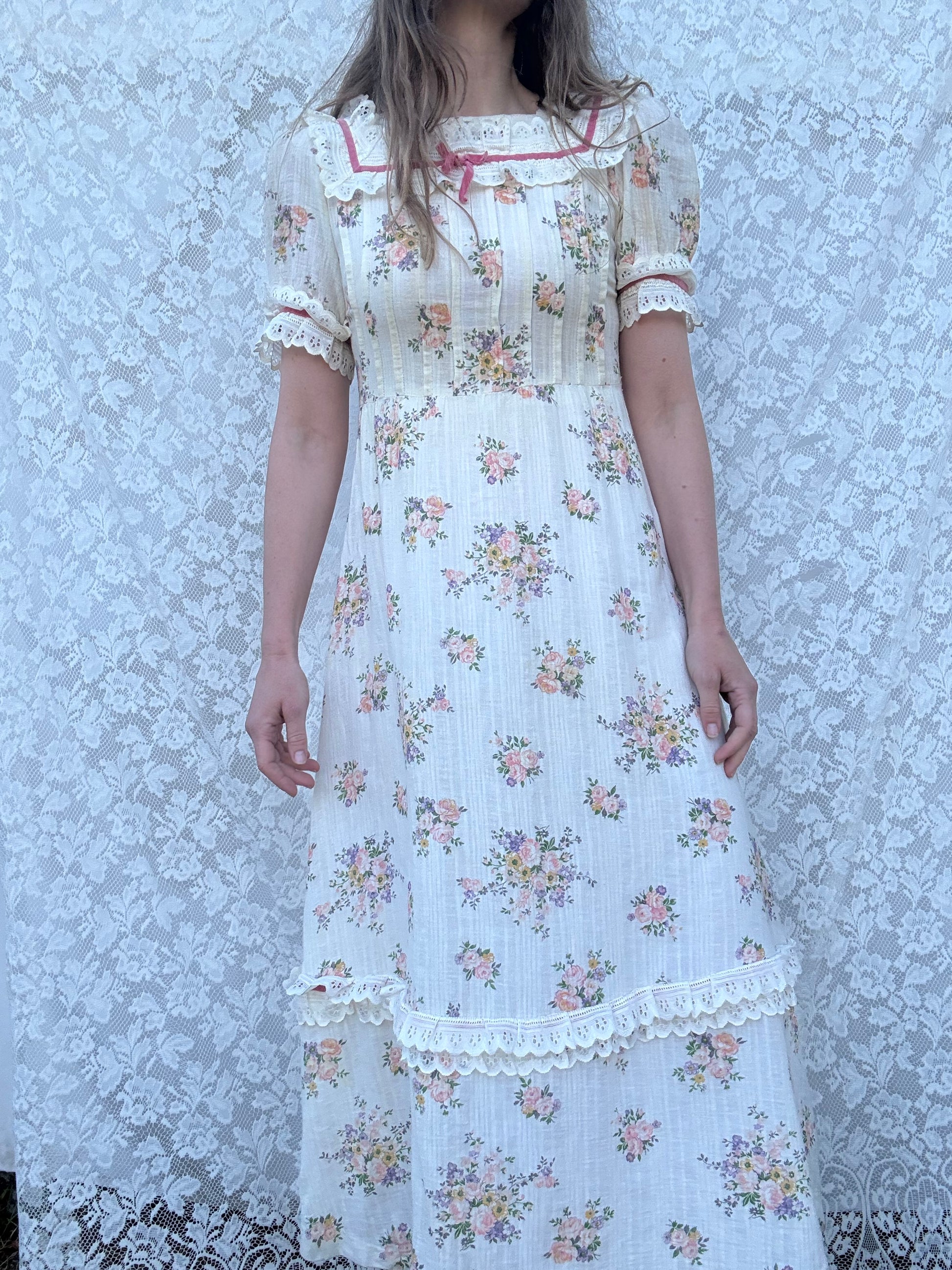 Vintage 1970's floral prairie dress with lace detailing.