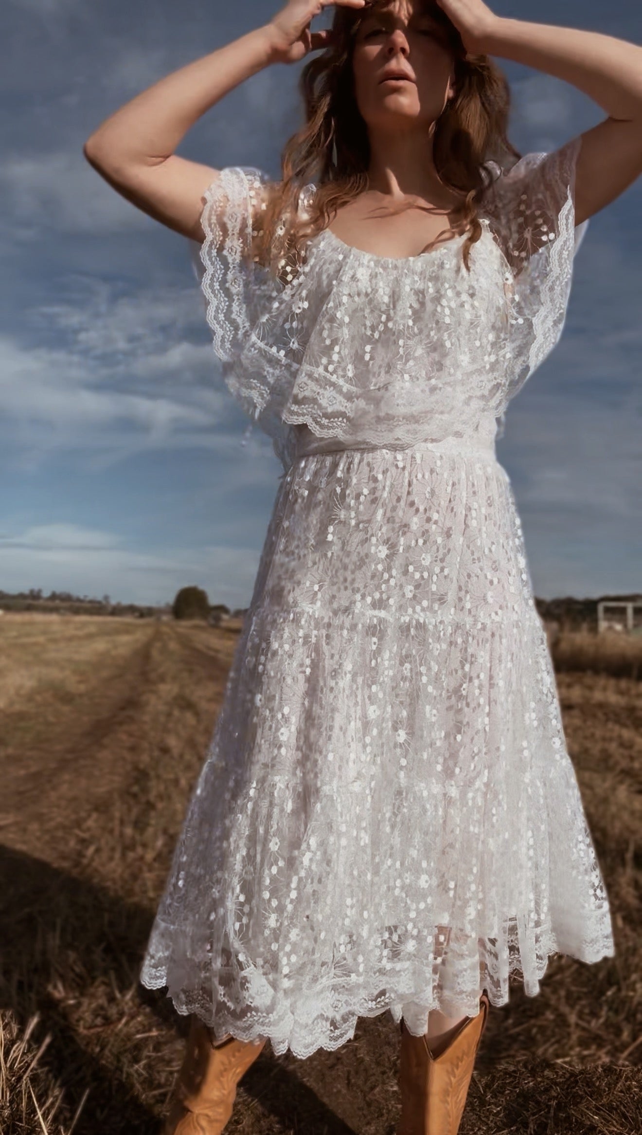 The silhouette is distinctly feminine, with a gently fitted waist, scoop neckline, and gathering that creates a soft, ethereal shape. Intricate lace trim and scalloped edges throughout add texture and detail, giving the dress that classic vintage prairie feel.