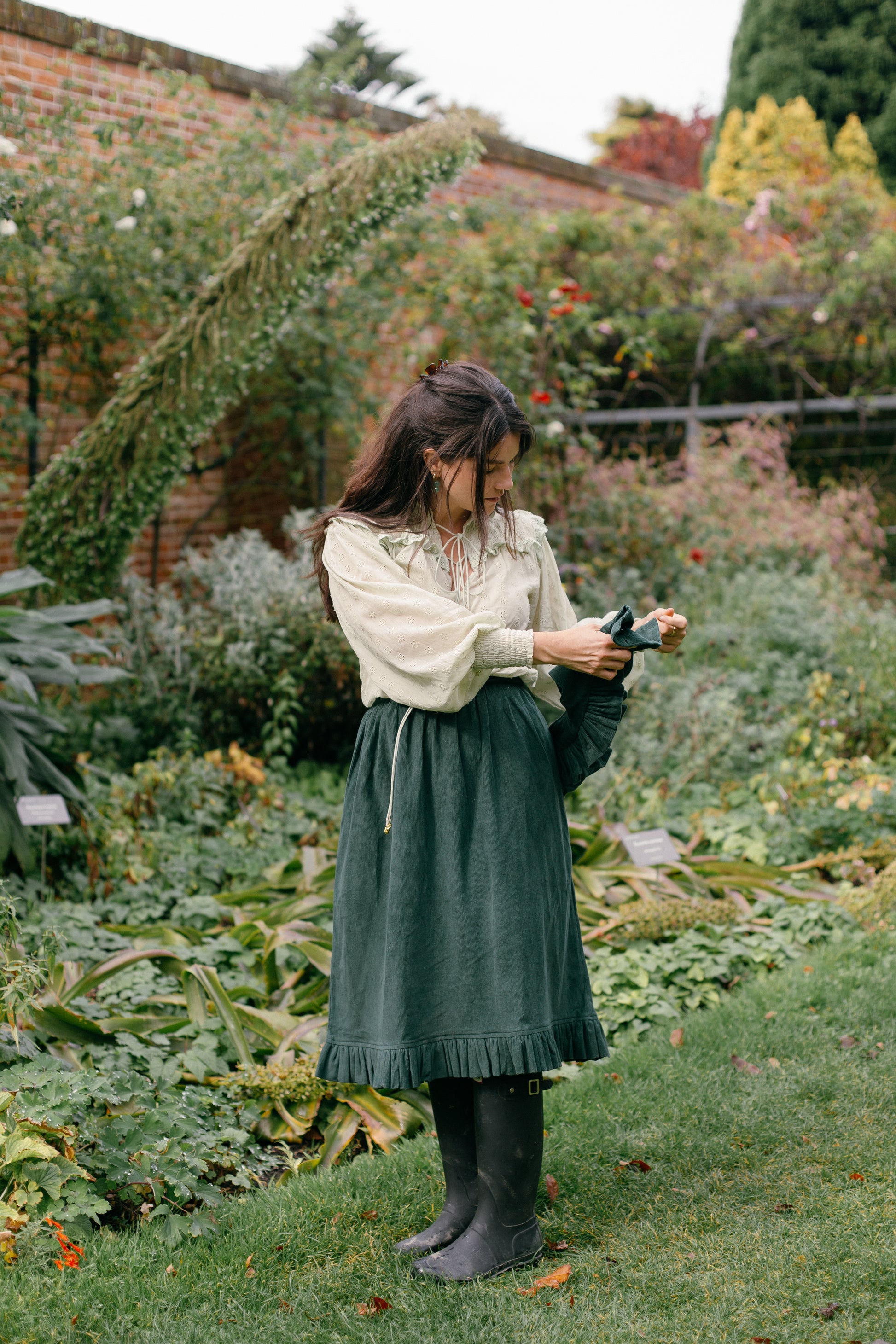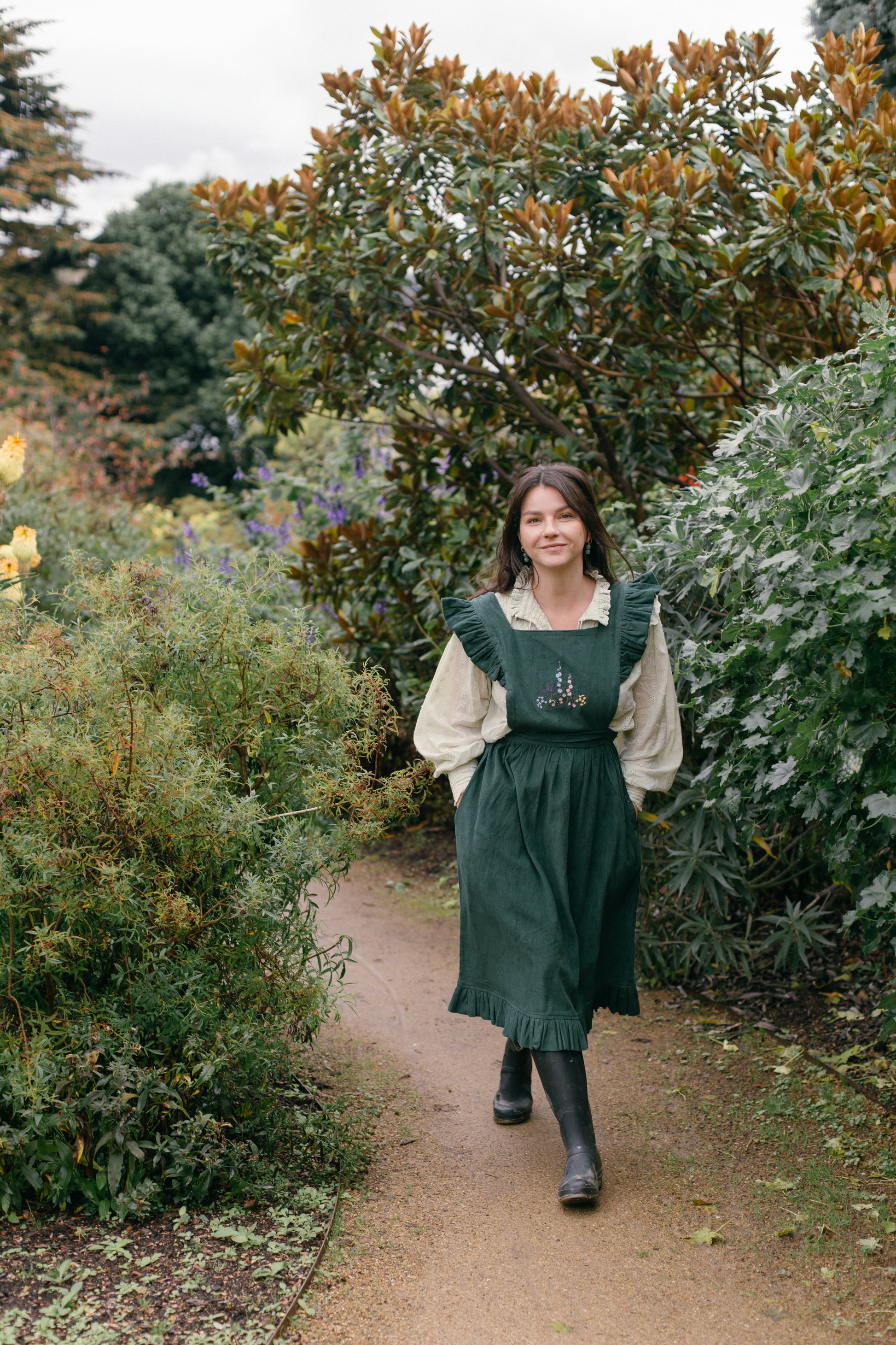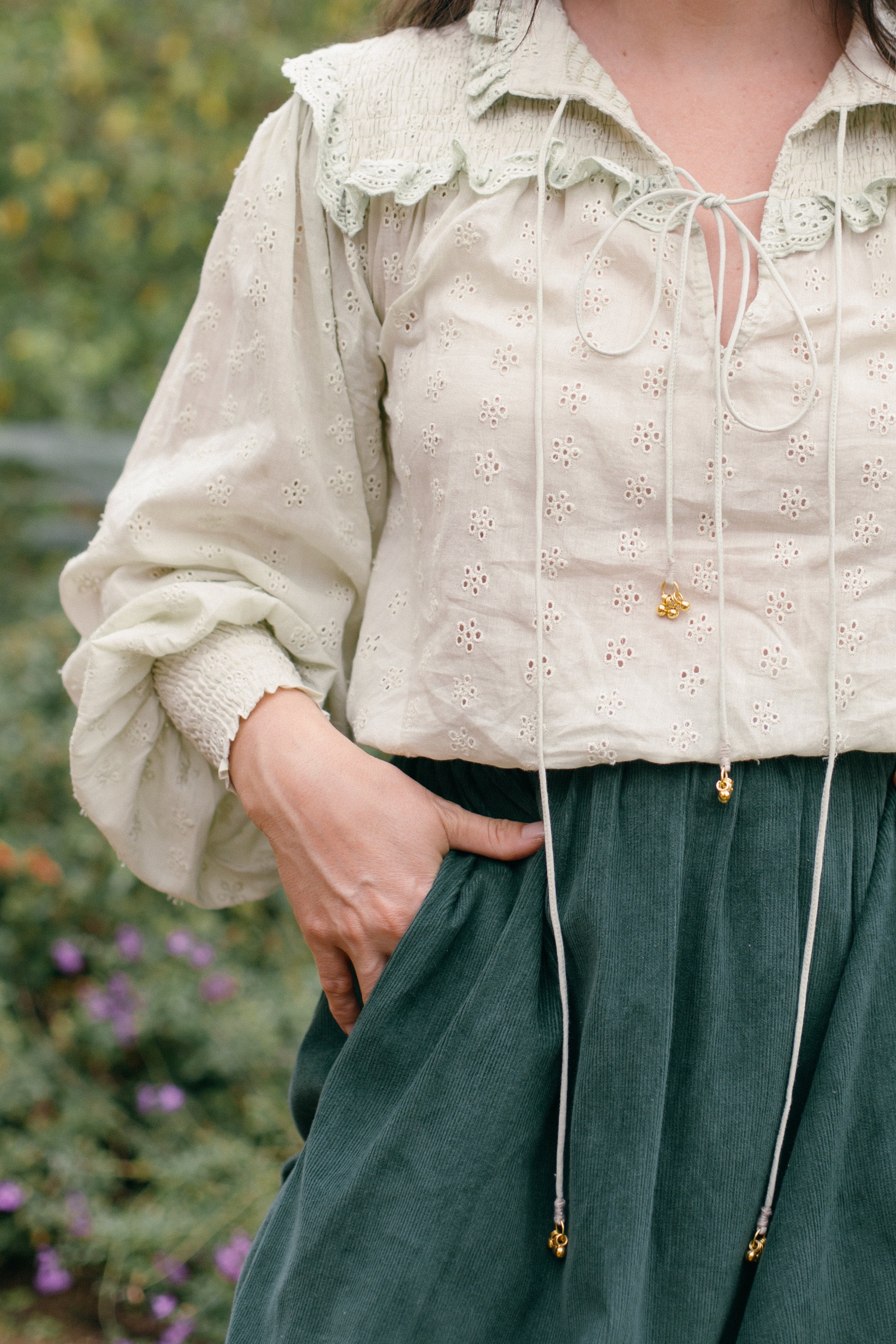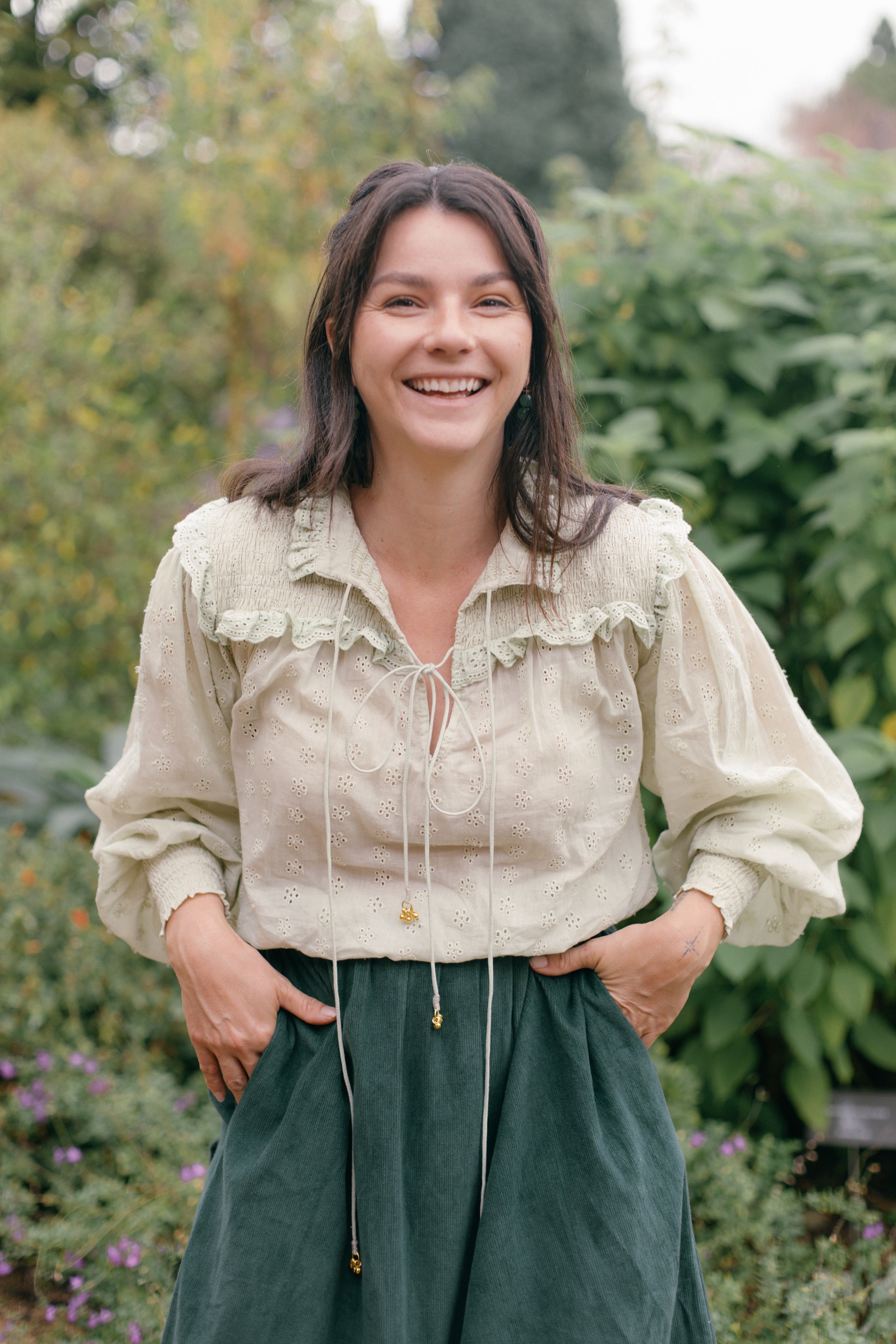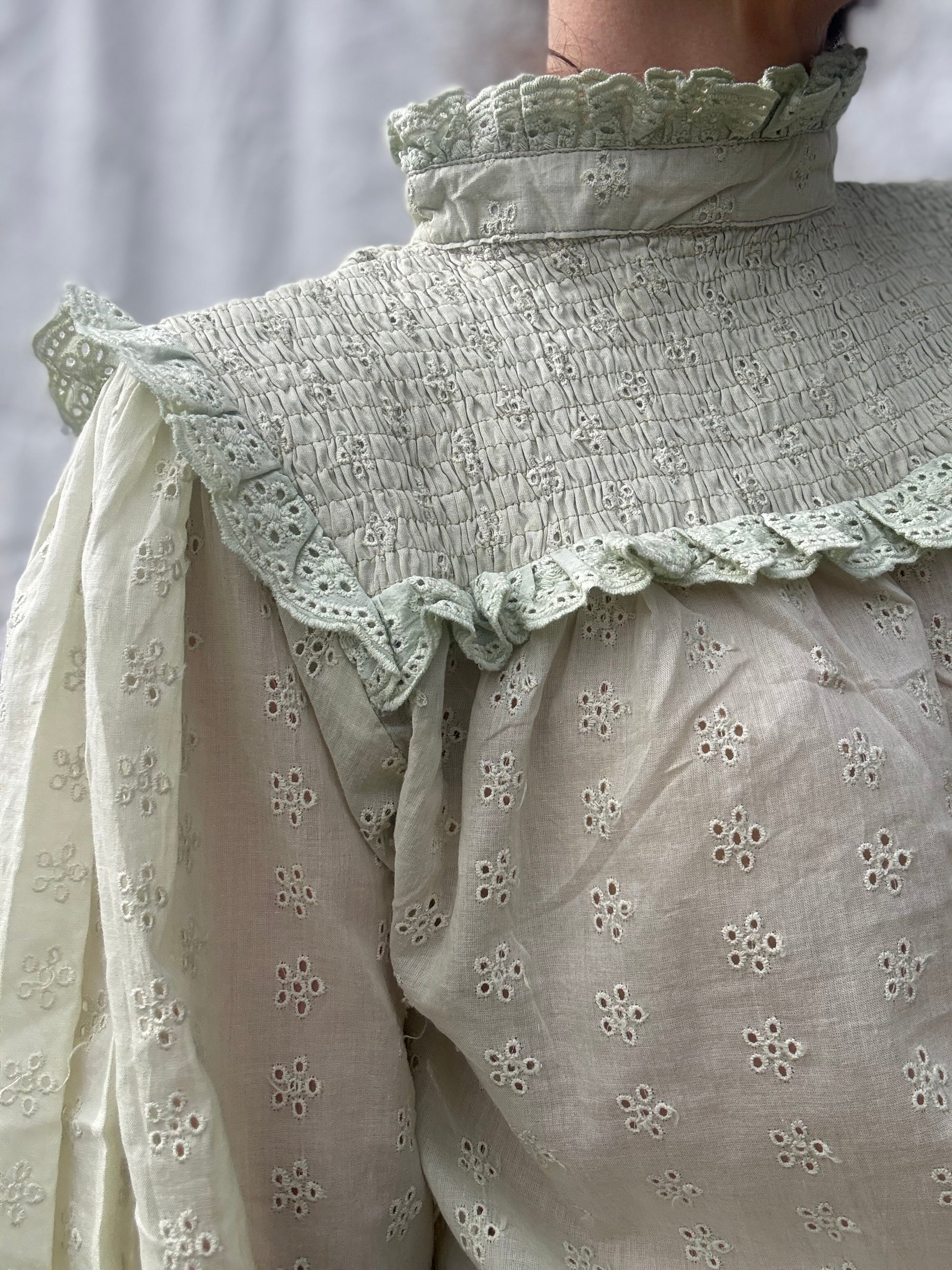 A blouse made for light and carefree days spent slowly outside in the garden. Modernised Edwardian, a beautifully floaty style that can be worn casually with your favourite jeans, or also has a slightly dressier edge in it's frill detailing. Embroidered throughout with small flowers giving the cotton some weight.