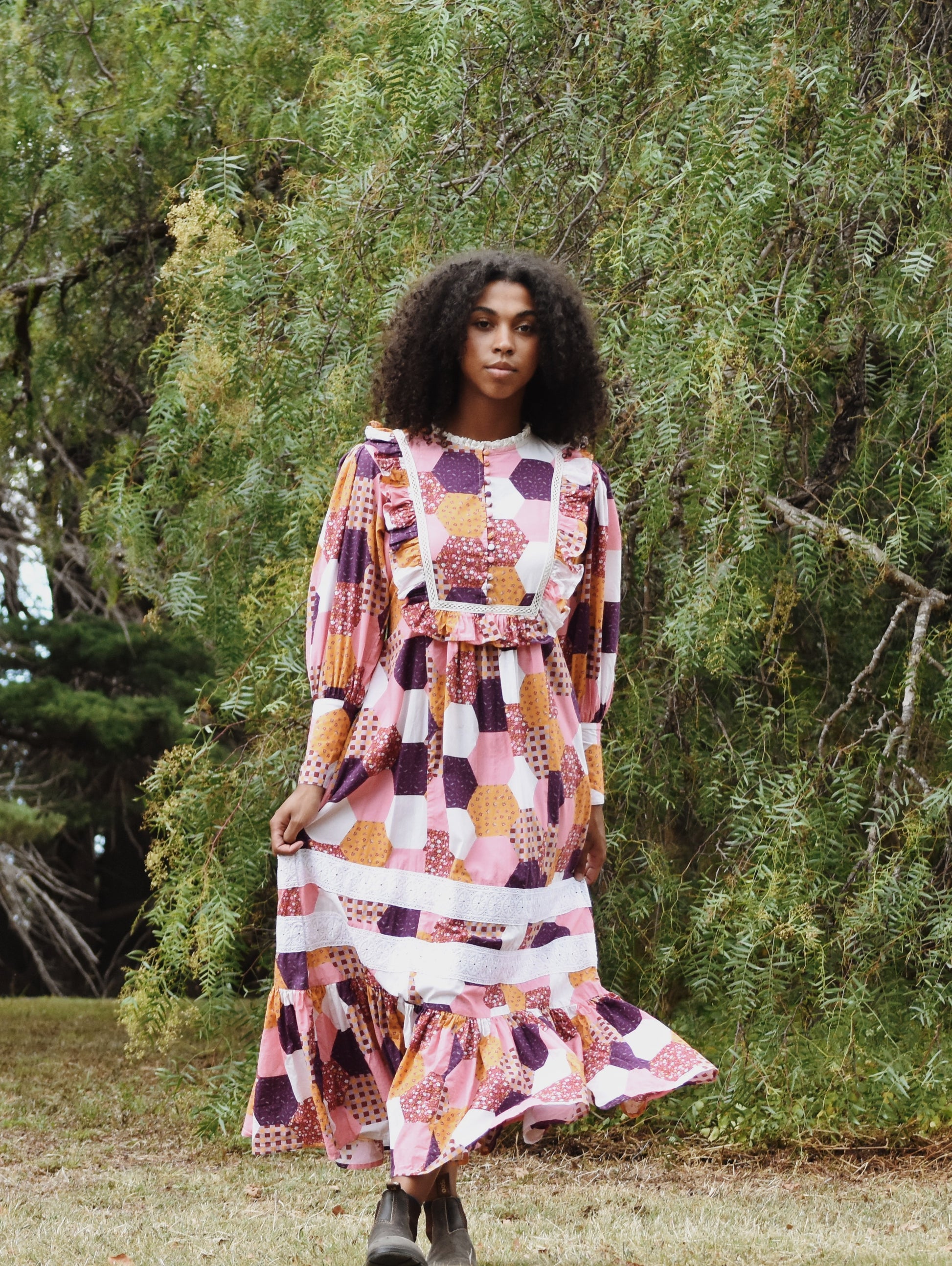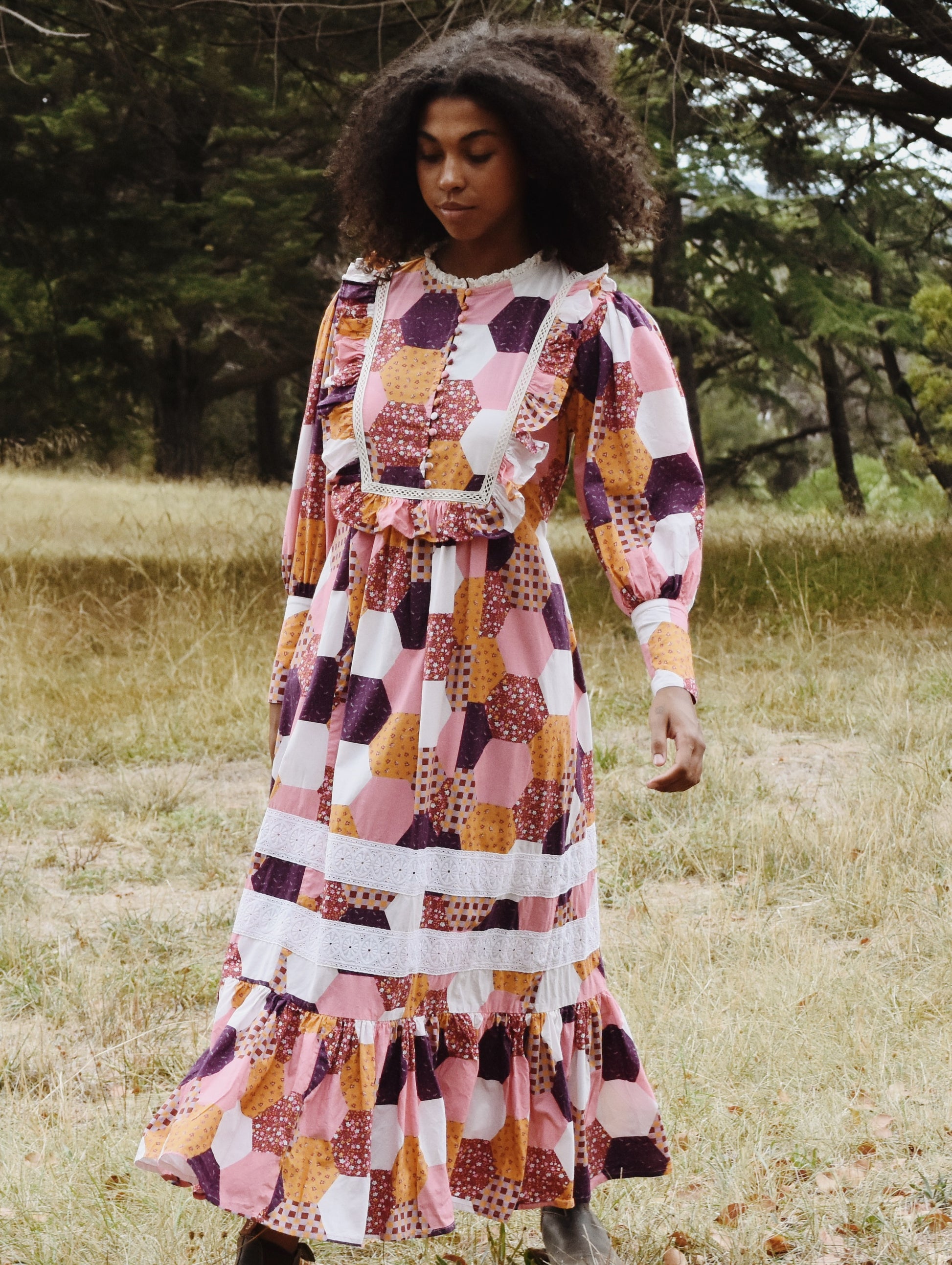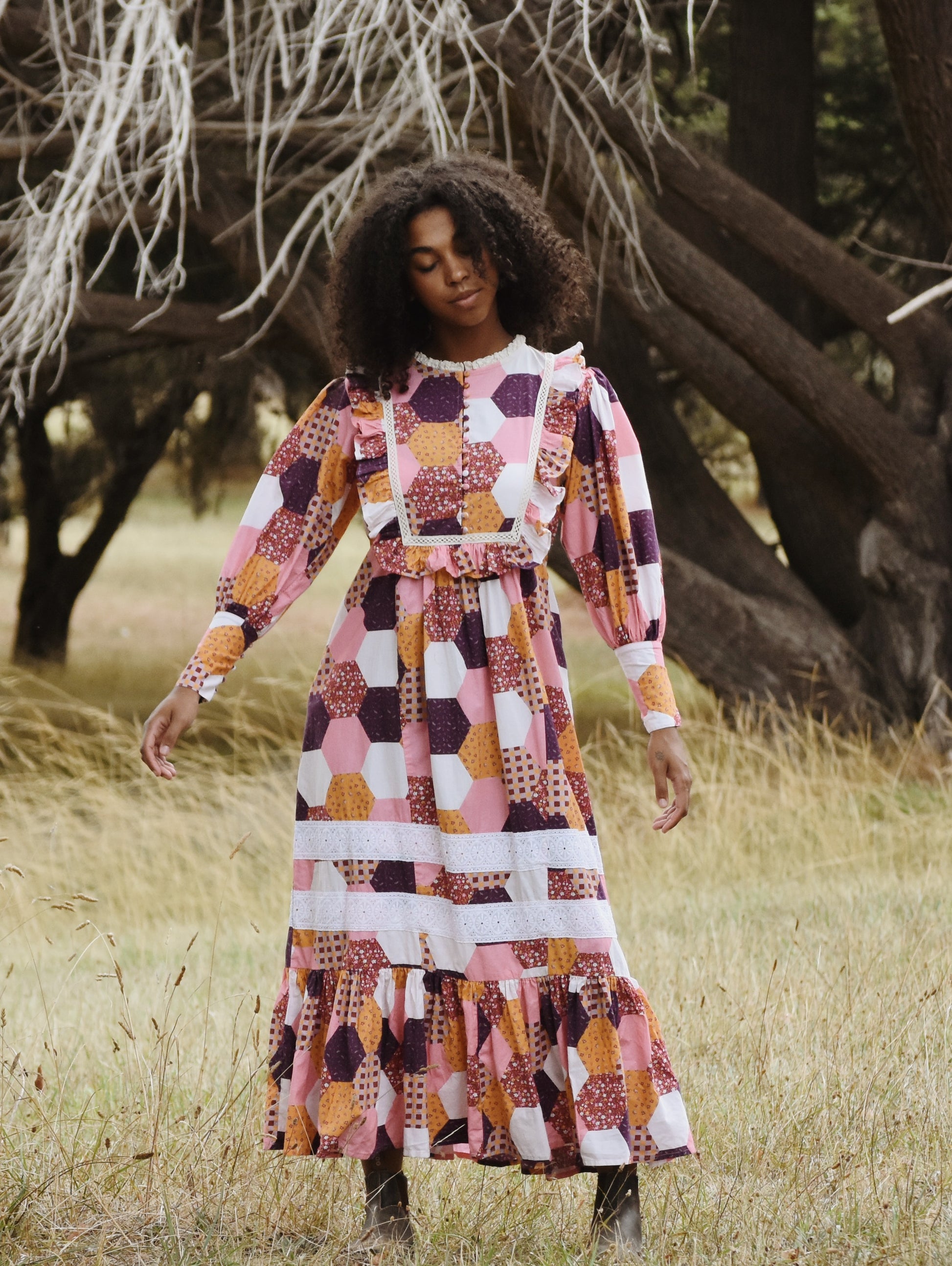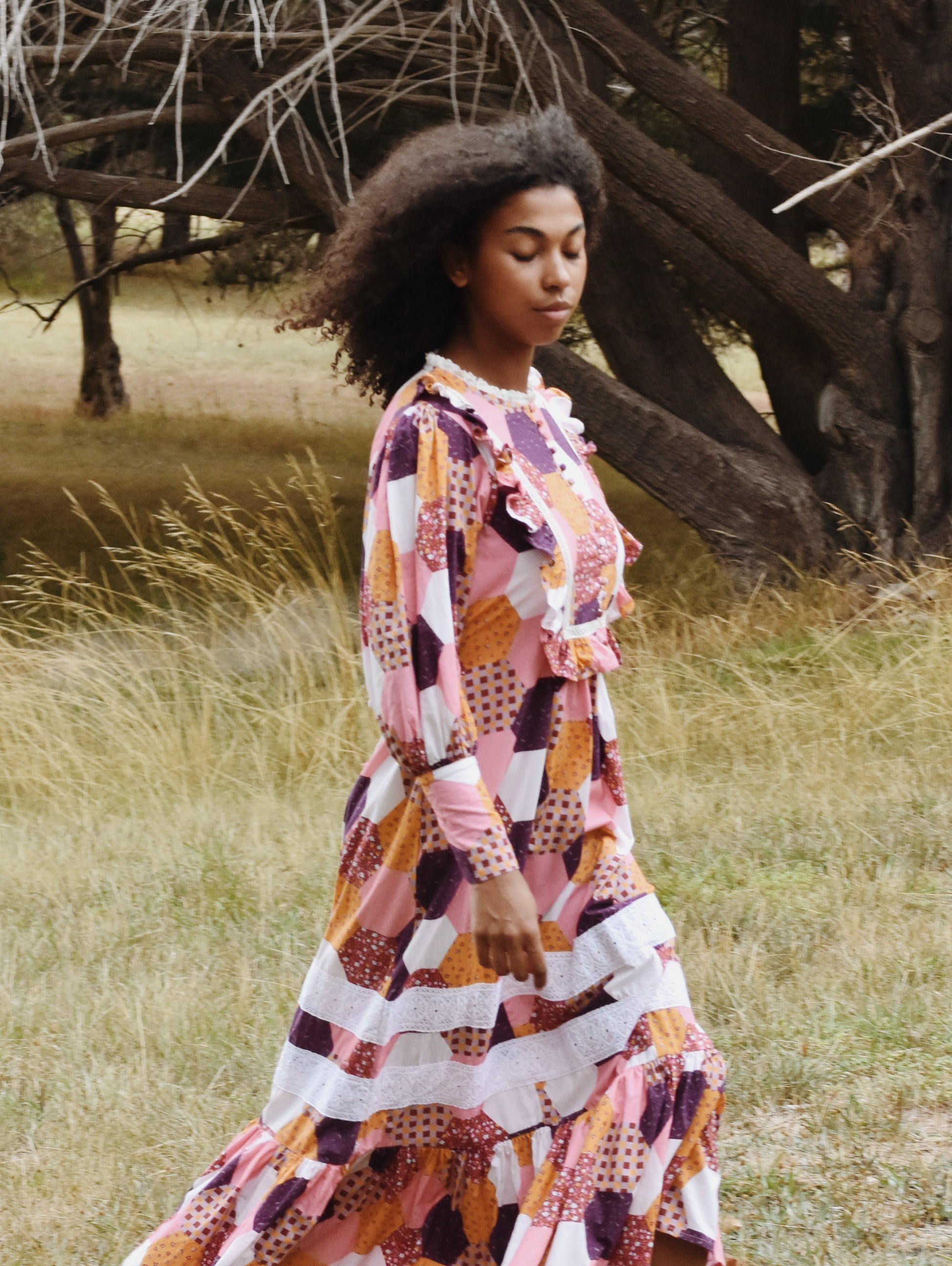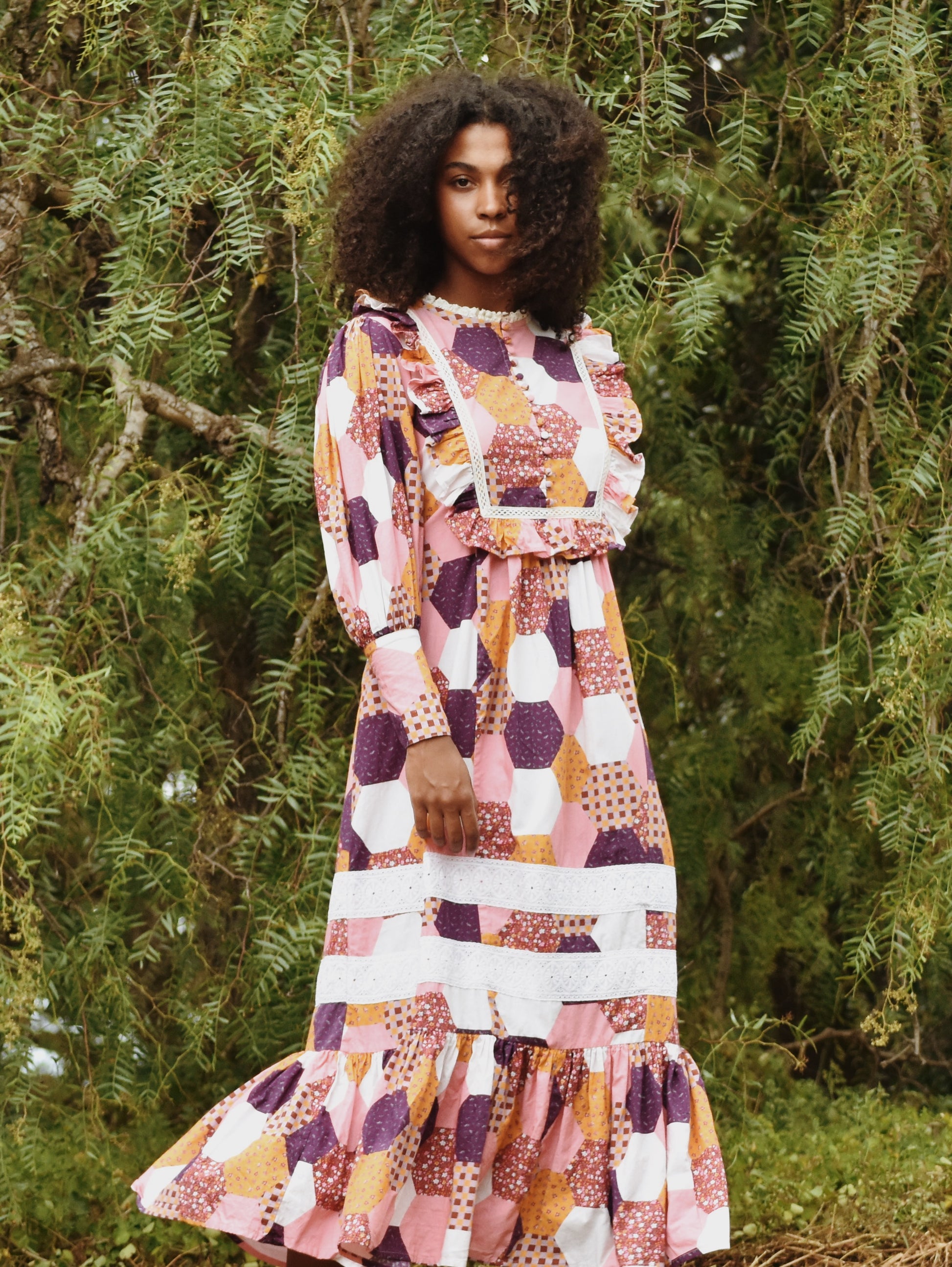 A dress that feel so perfectly vintage with her high neckline, embroidered cotton lace detailing and made in a hand drawn custom ANKOA patchwork print.
