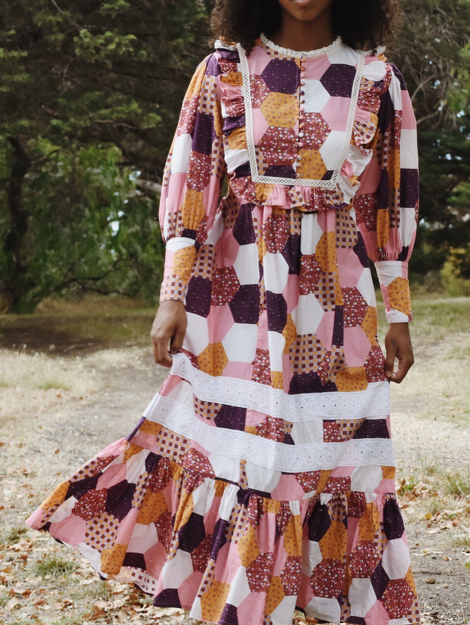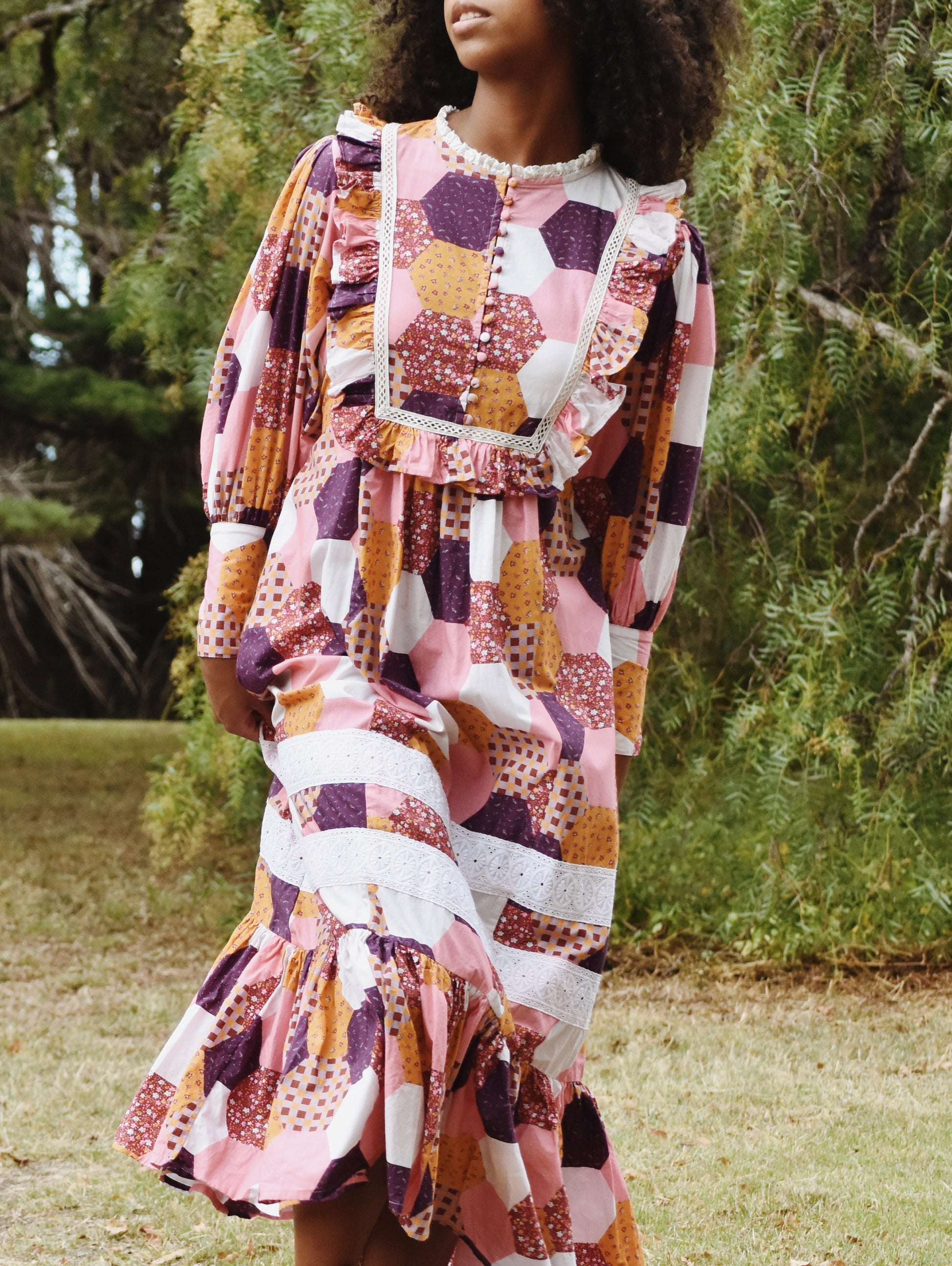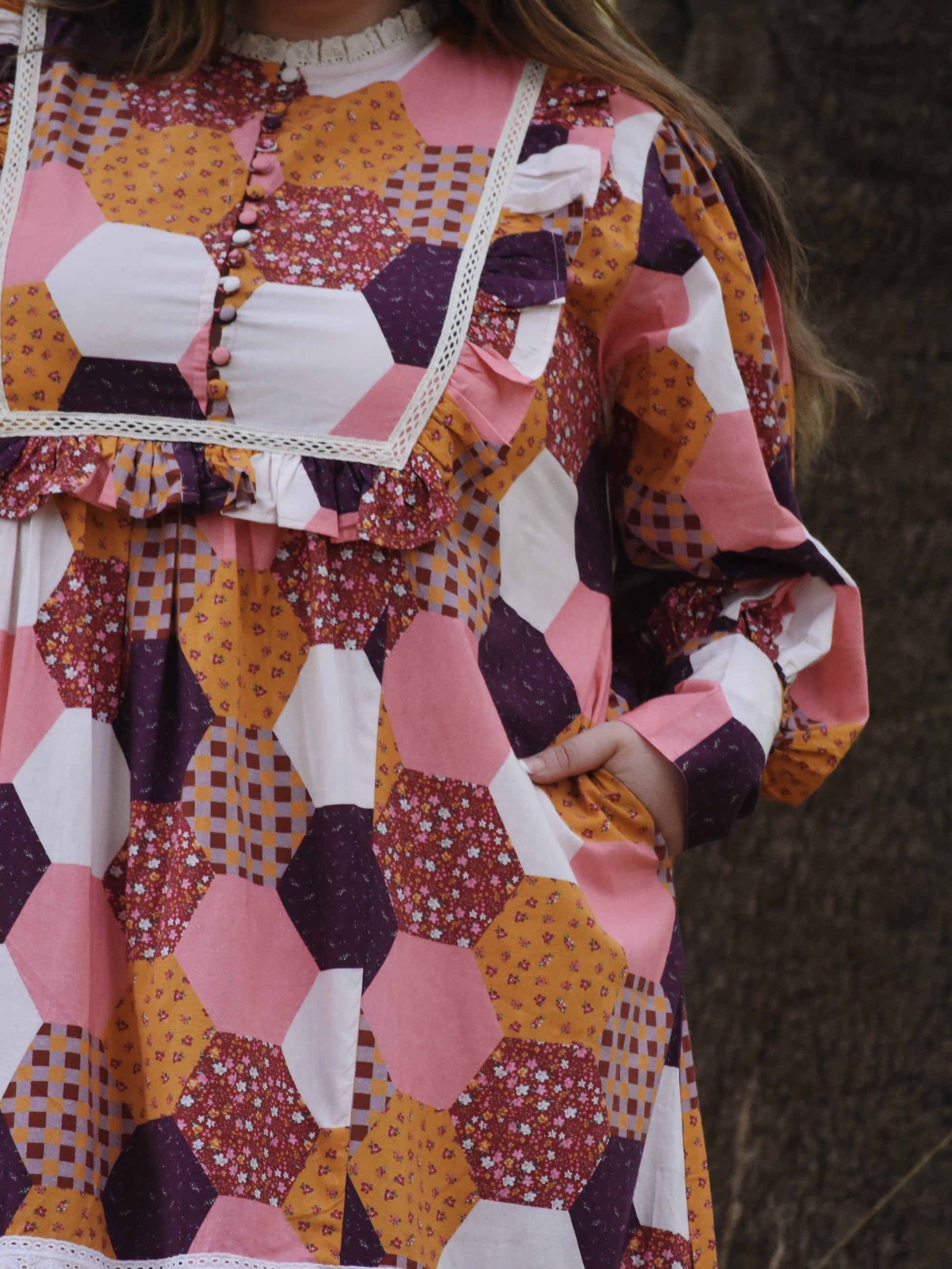 100% RECYCLED COTTON - CLARA DRESS HEXIE PATCHWORK PRINT