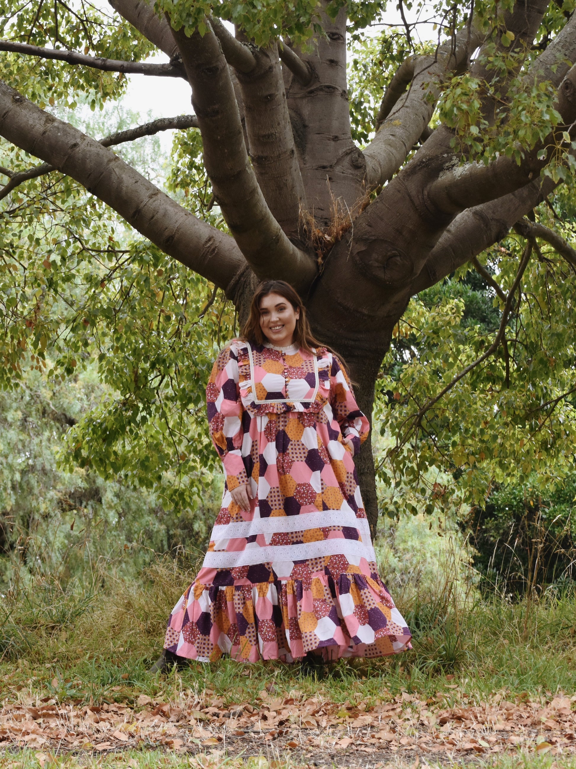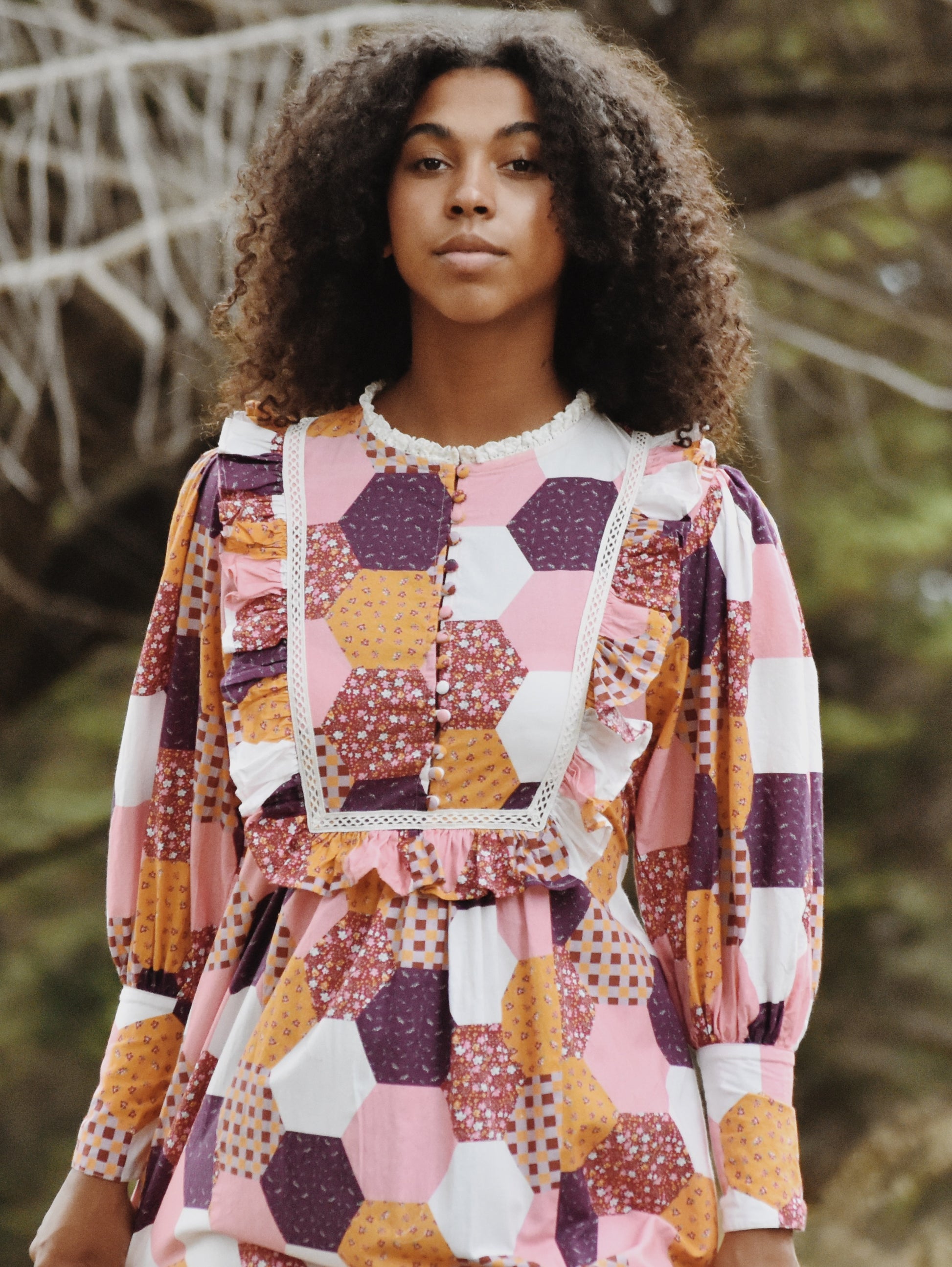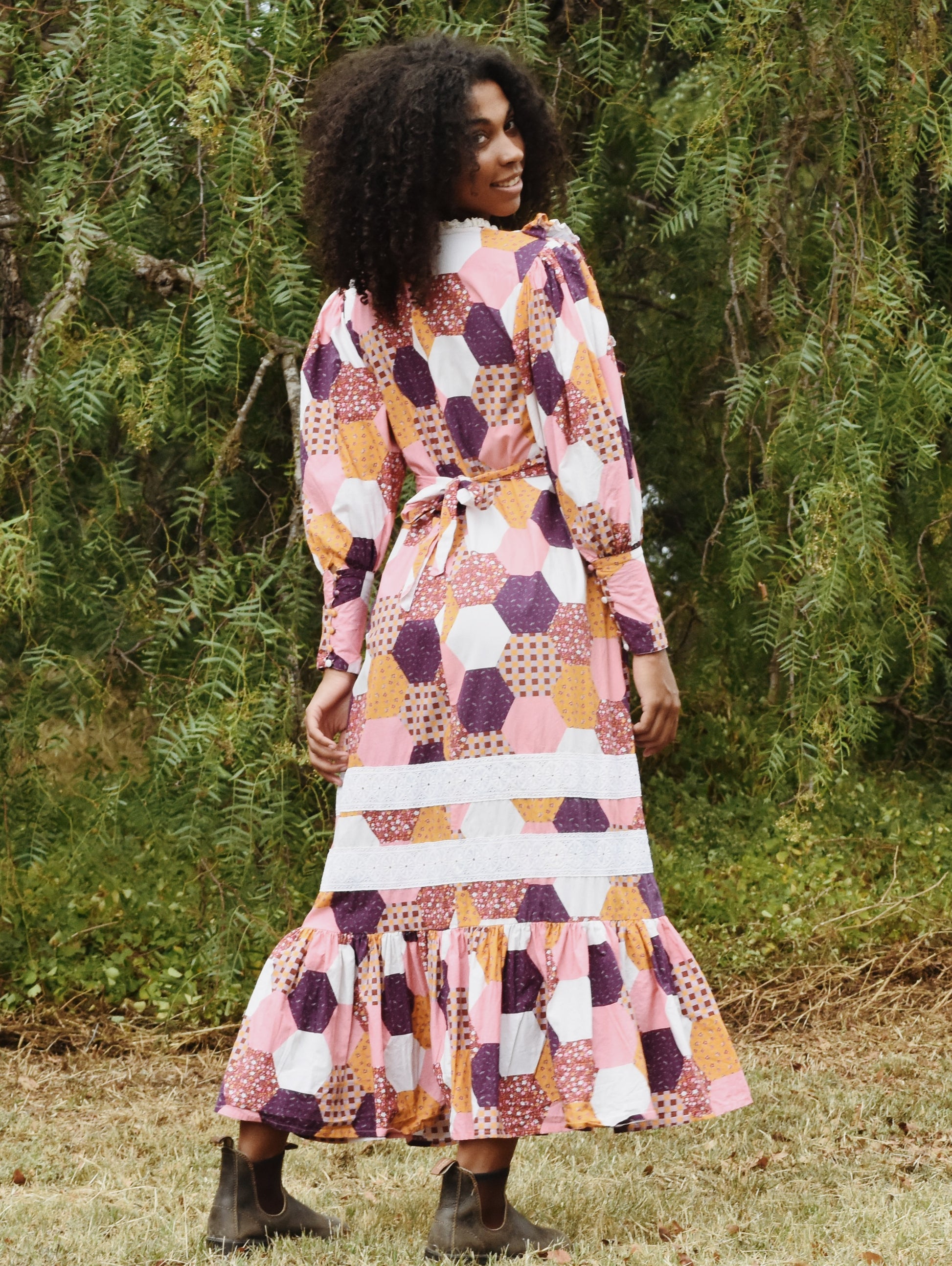 100% RECYCLED COTTON - CLARA DRESS HEXIE PATCHWORK PRINT