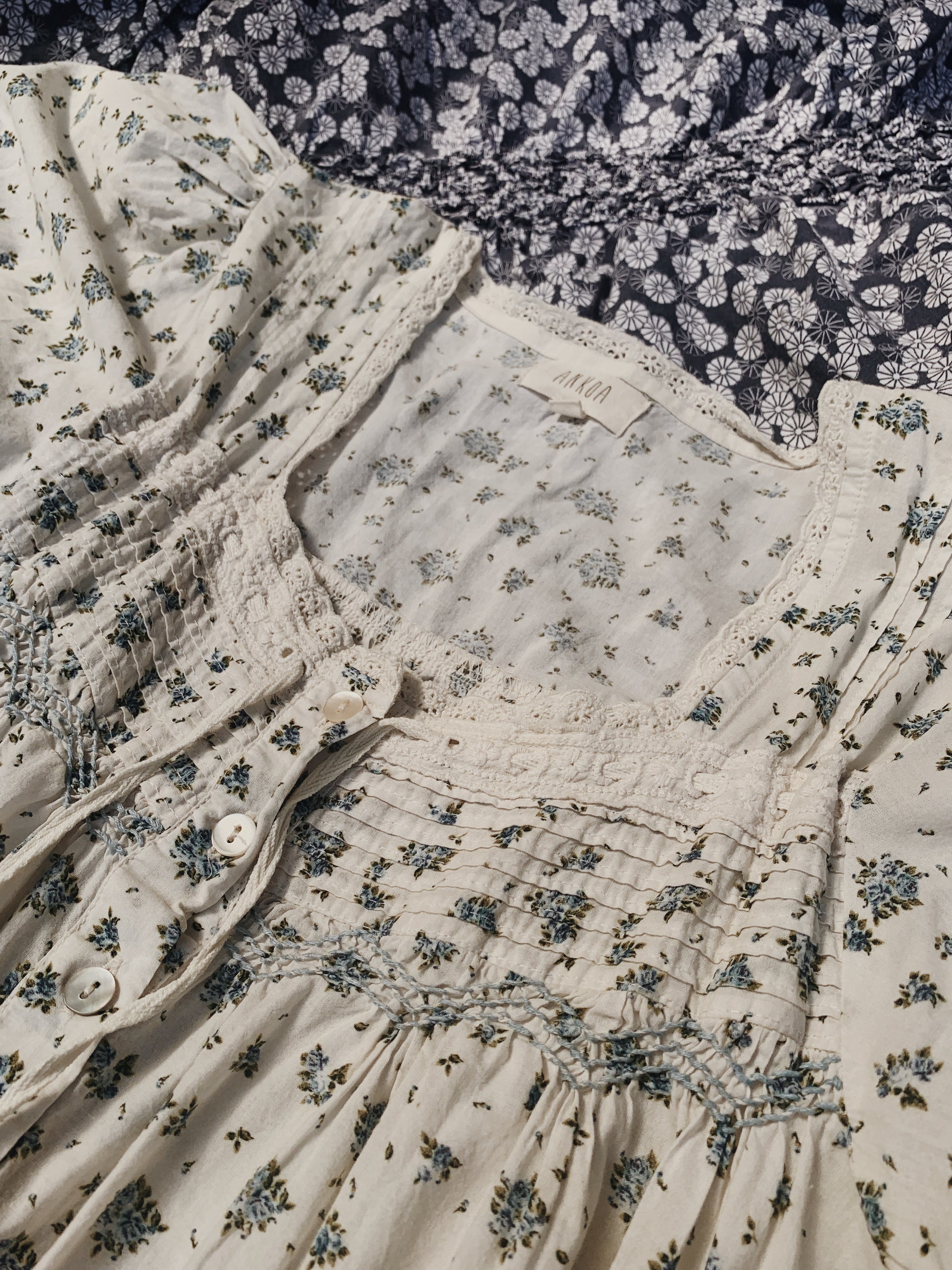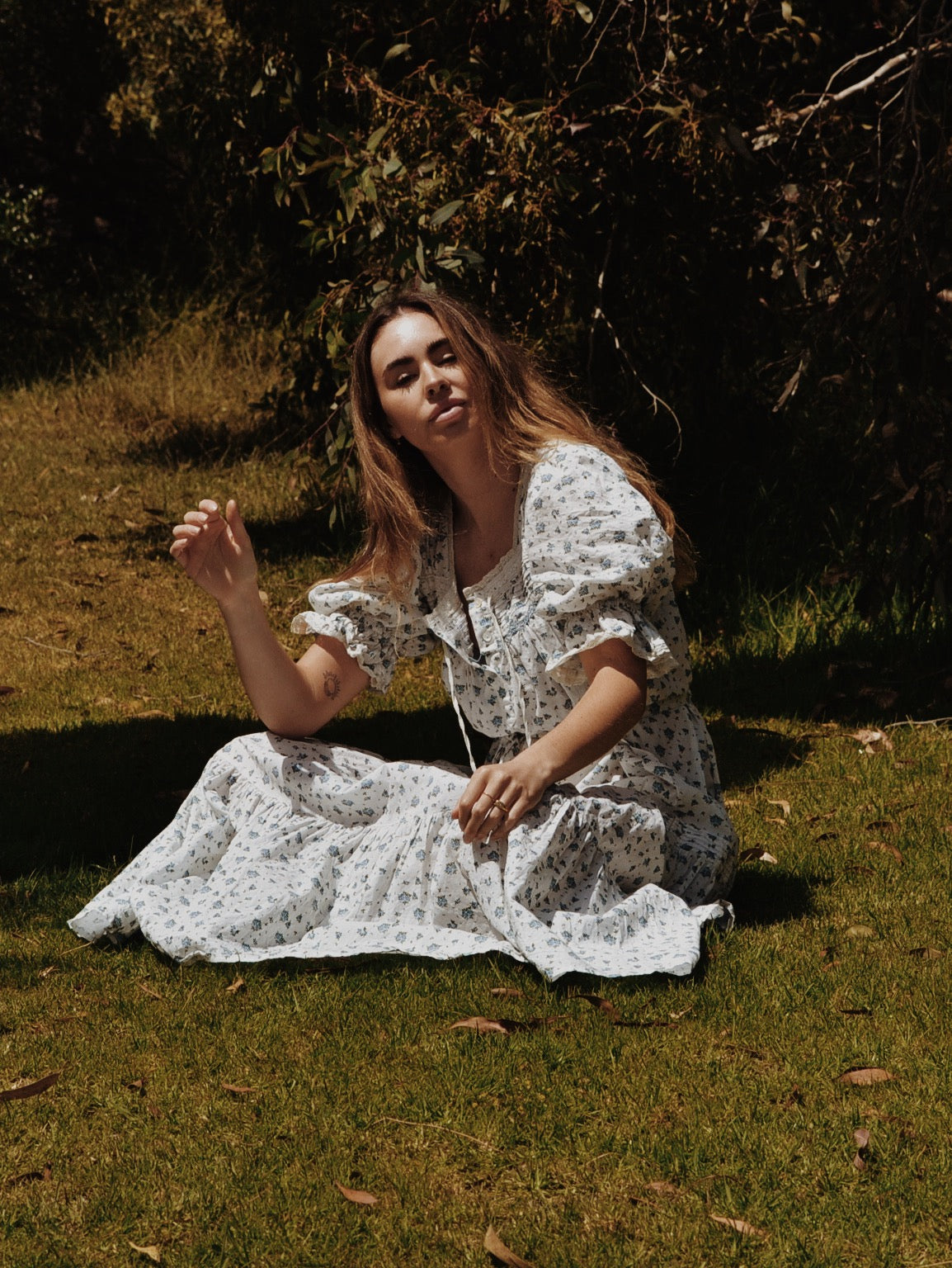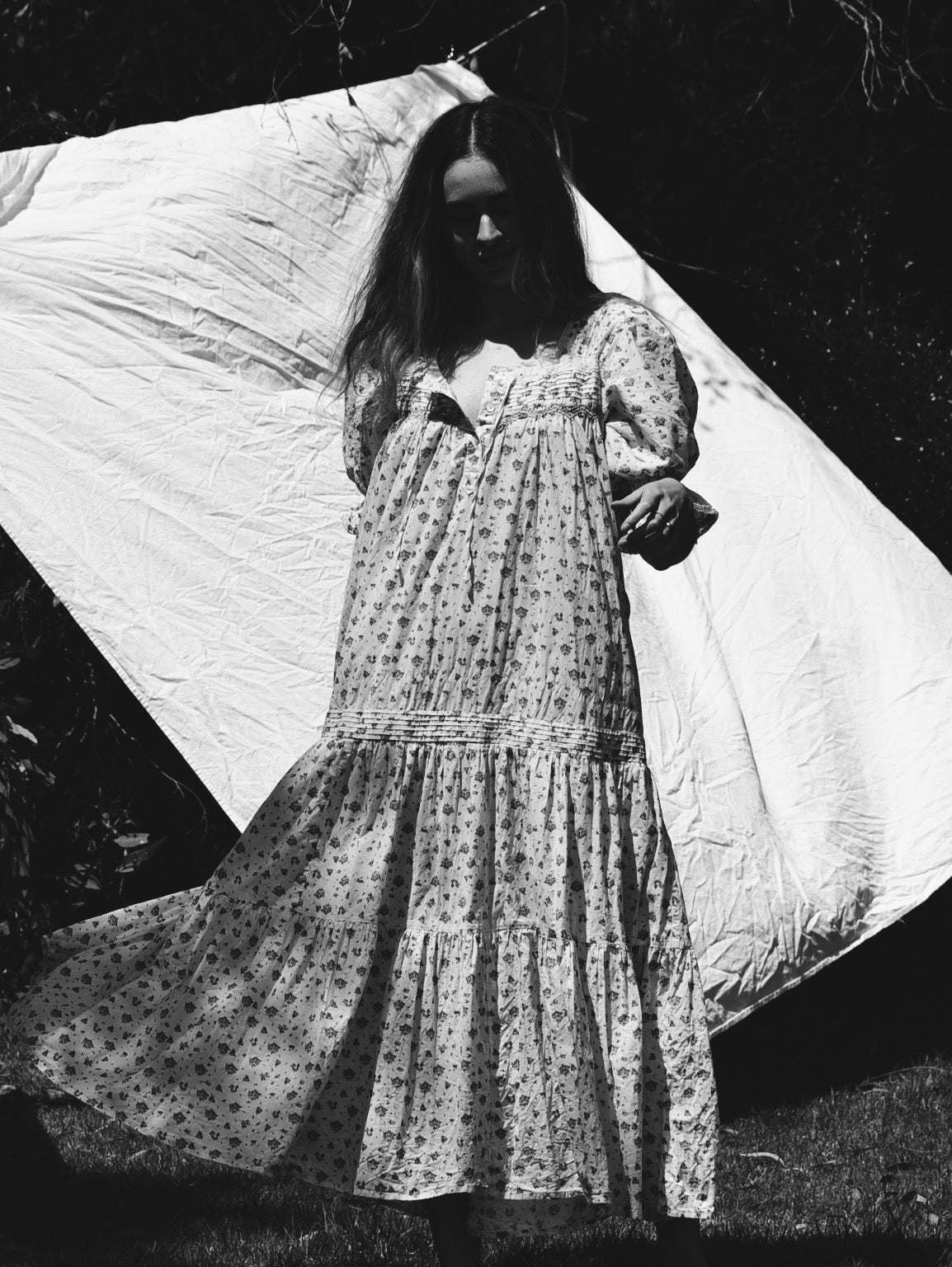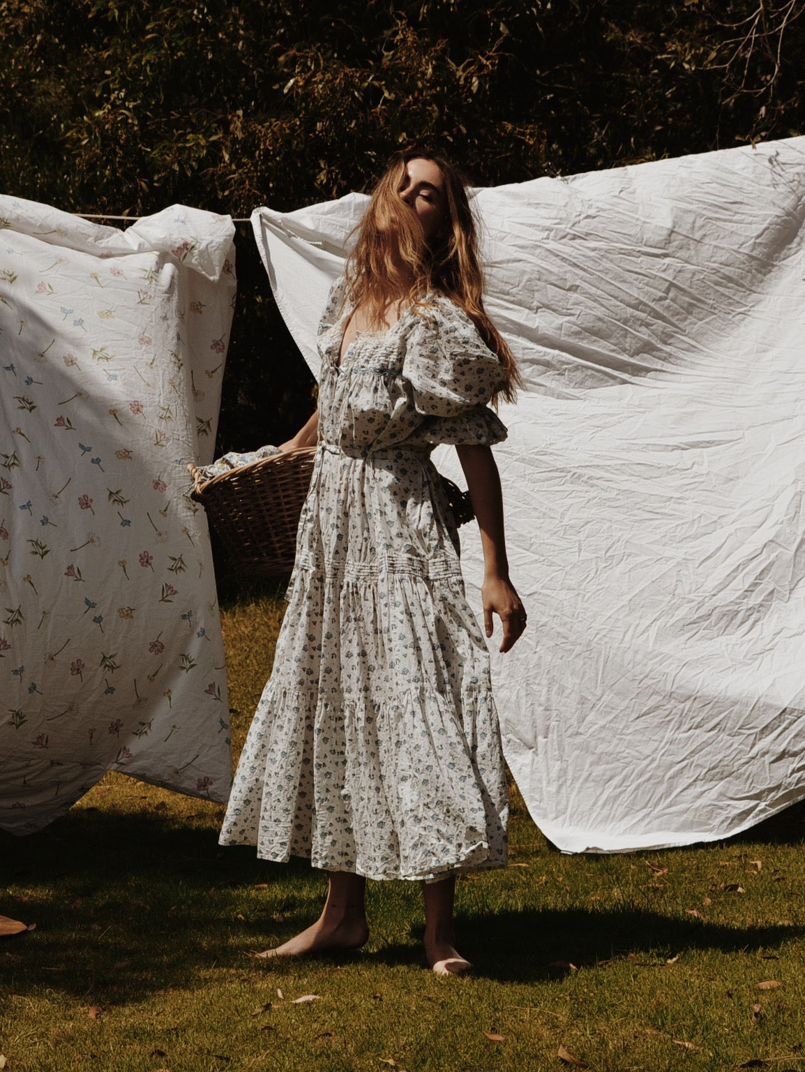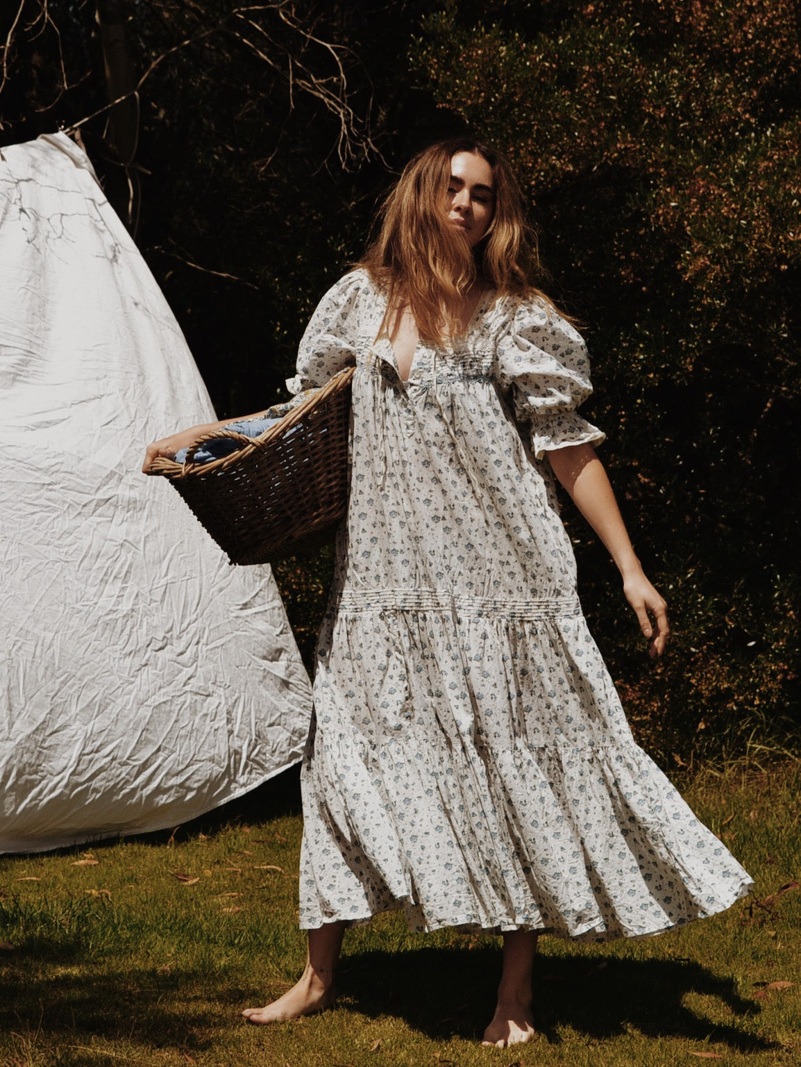 100% Recycled Cotton. Soft, dreamy and delicate. A wonderfully billowy dress, light and airy to wear, wear loose and carefree or cinch at the waist with the removable waist tie. Functional buttons open up making breastfeeding easy. Puffed elasticised sleeves are a feature along with intricate hand smocking which is a beautifully slow and time consuming process. Perfectly dreamy for a dressier occasion or functional enough to wear gardening or pottering around the house.