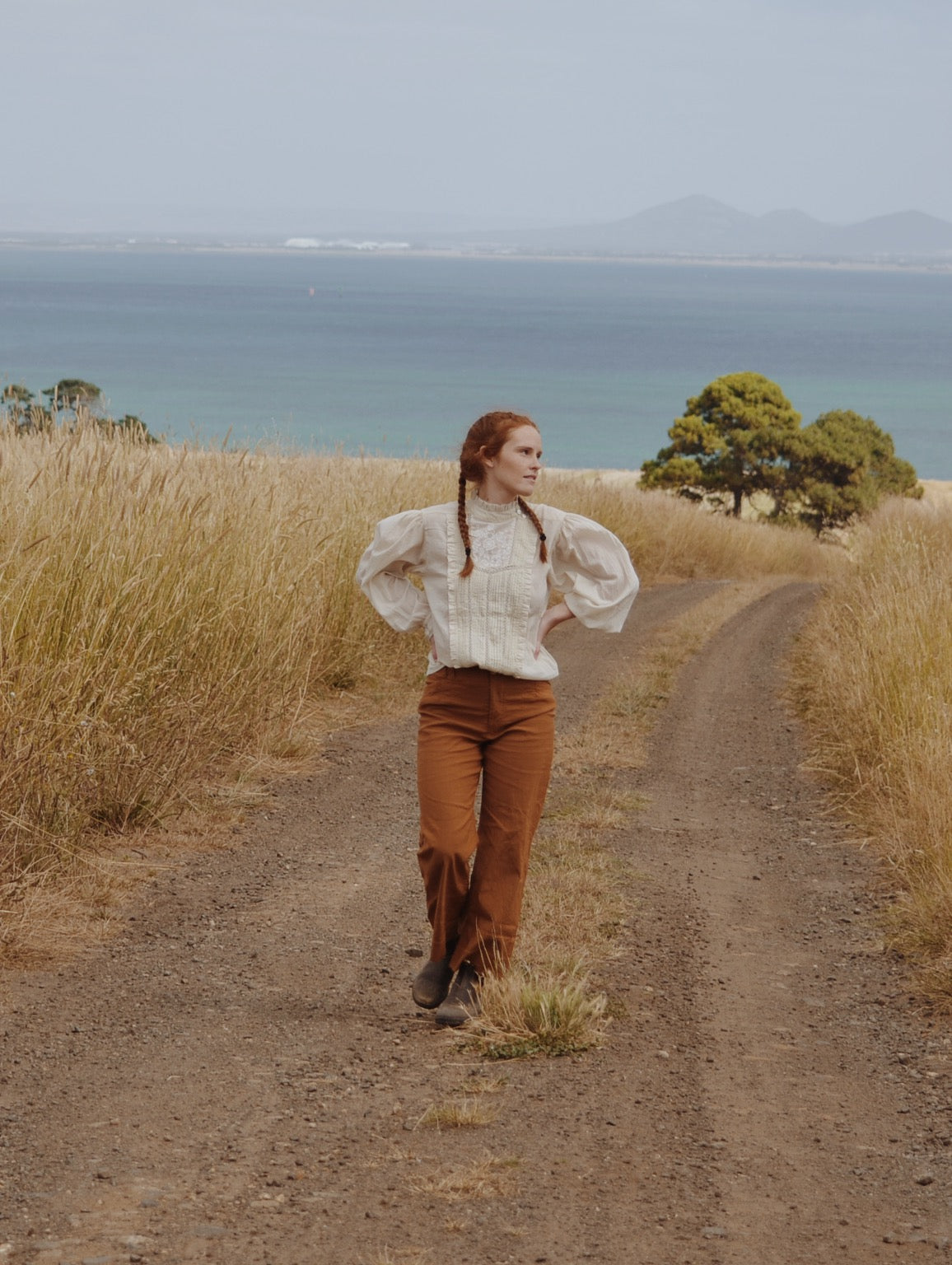 A classic blouse you will treasure, made for slow days spent wandering in a reverie. This beauty will take you to a time and place far away. Little nods to nostalgia include the Edwardian inspired high neckline with gathers, lace detailing, pin tucks and a beautiful embroidered feature.