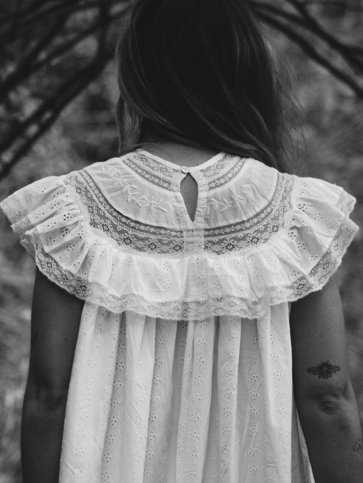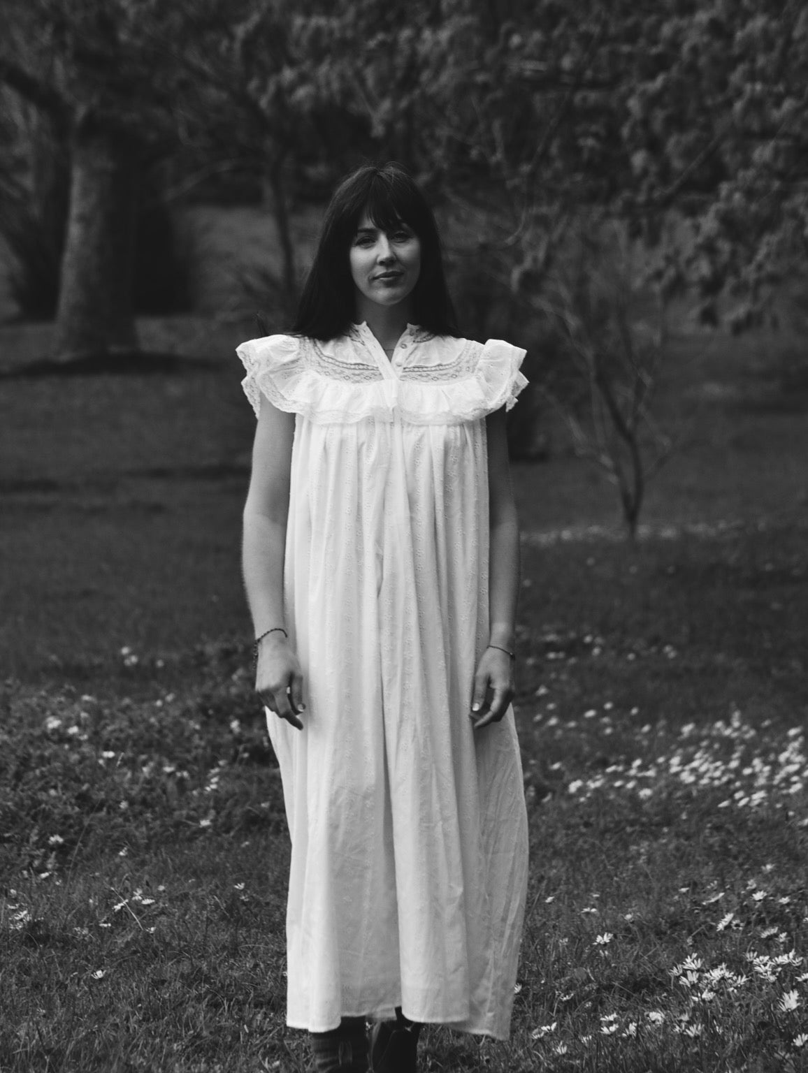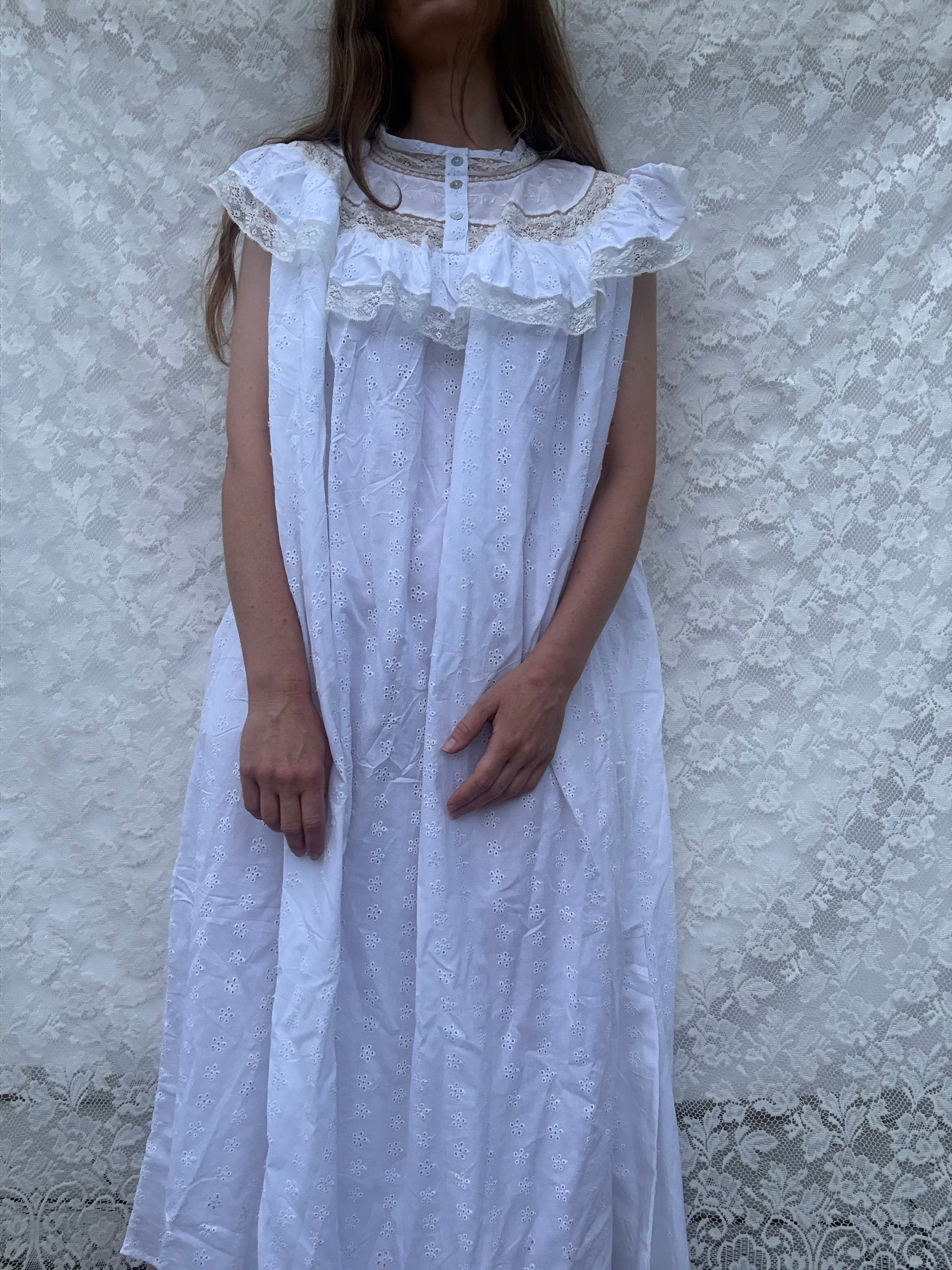 Beautiful embroidery sits alongside a detailed lace yoke, a slow and time consuming process to produce. Perfectly dreamy for a dressier occasion with a leather belt and boots or functional enough to wear gardening, pottering or for sleep.