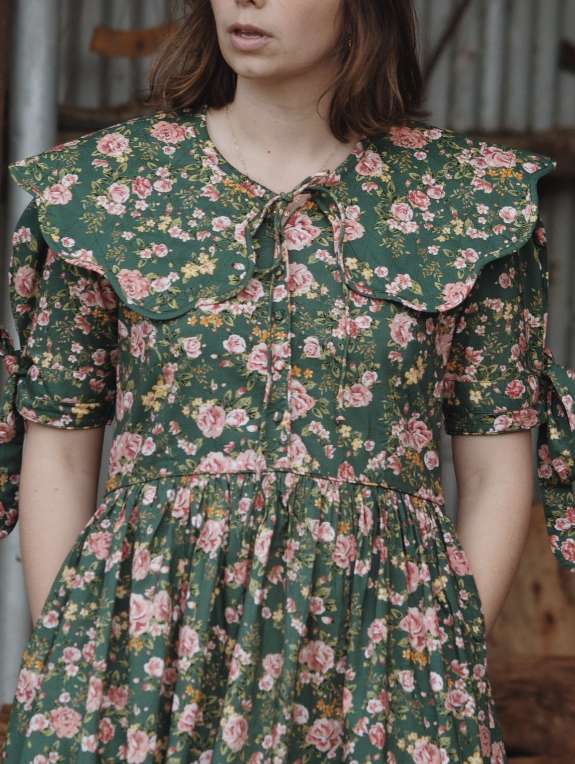 This dress is wonderfully versatile, with functional buttons you can wear this one pressed open if you prefer more of a v neck cut, or closed with the fabric buttons. The removable scalloped collar gives you an option to completely change the look and style of the dress.