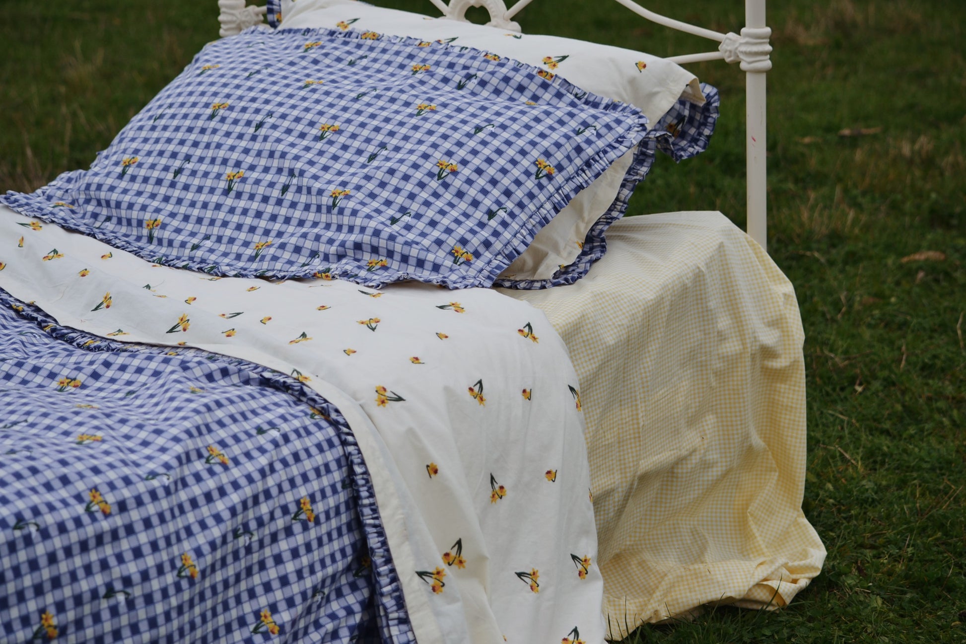 The pillows have two sides. One is the blue gingham with embroidery, the other is the antique white with daffodils embroidered throughout. Both feature a gathered gingham border.