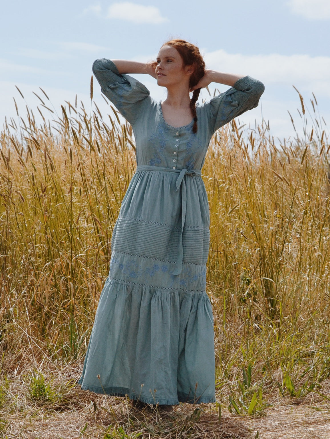 A take on the Faustine dress. There is something beautifully sentimental about the Augustine, she will pull on your heart strings and have you feeling wistfully nostalgic. Perfect for mornings spent baking and listening to French music and then venturing out in the sunshine for a picnic.