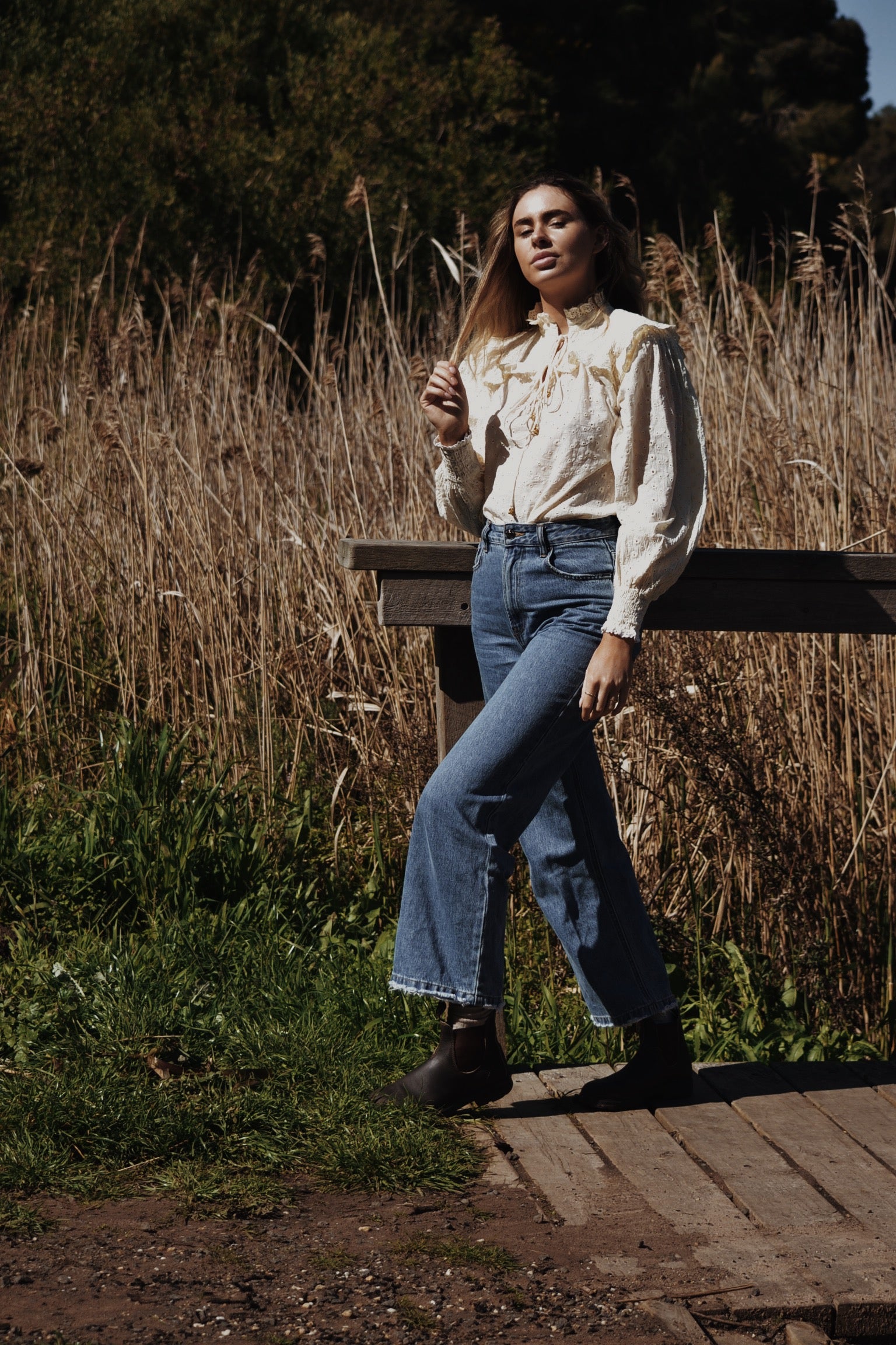 100% cotton. A blouse made for light and carefree days spent slowly outside in the garden. Modernised Edwardian, a beautifully floaty style that can be worn casually with your favourite jeans, or also has a slightly dressier edge in it's cotton lace frill detailing. The shirred yoke can be worn open casually or as a high neck, making it also ideal for feeding. To get the ultimate wear out of your blouse, you can also flip in around to a closed high neck look too as seen in photos.