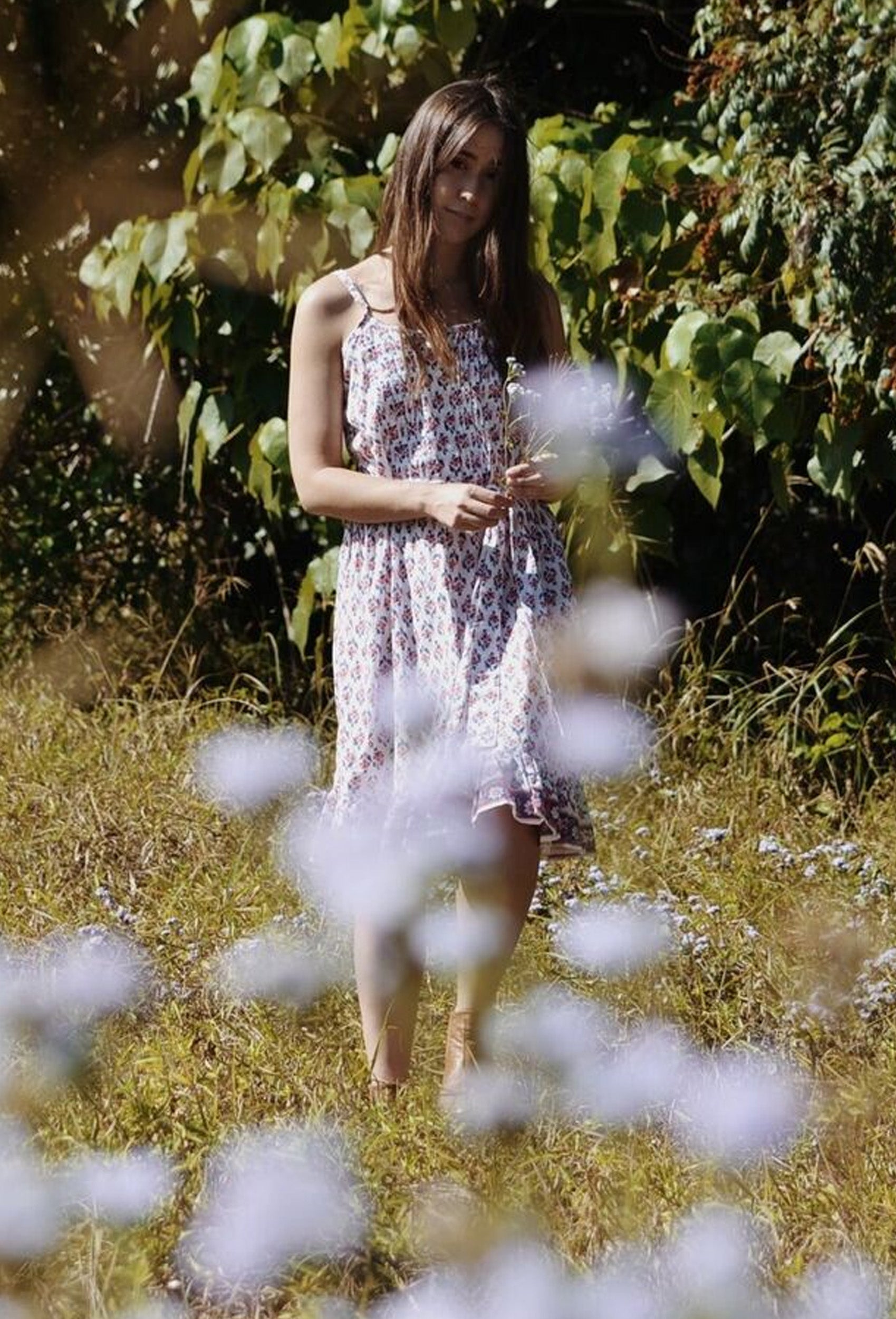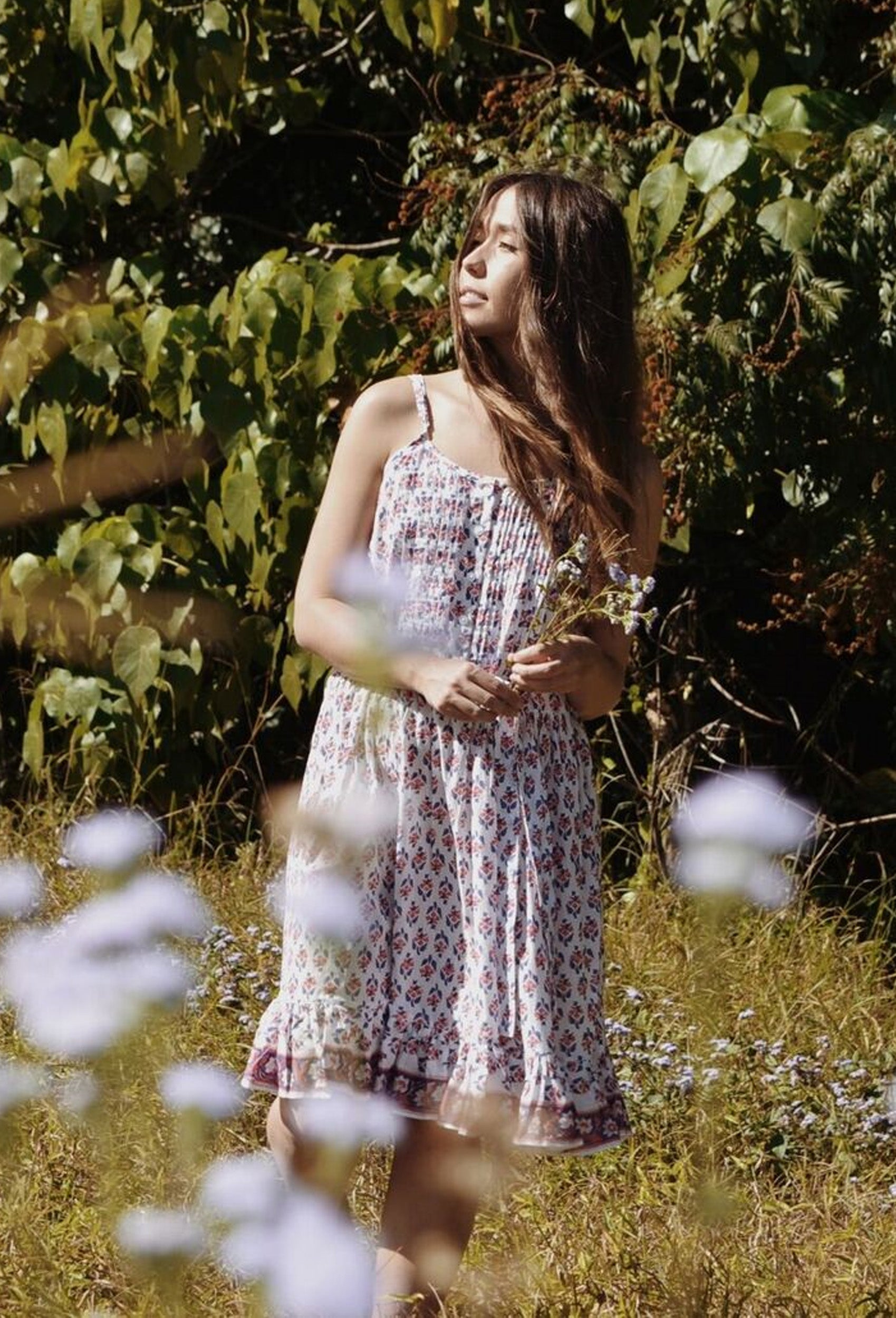The perfect Summer day dress. Features a gorgeous pintuck pinafore with a button down front which can be worn as pictured or casually undone, perfect for all those breastfeeding Mamas. The beautifully floaty shape of the dress can be worn loosely or cinched at the waist with a self fabric belt. Wear on breezy Summer afternoons by the sea or throw a blouse an over the top and wear as a skirt highlighting the ruffled hem.