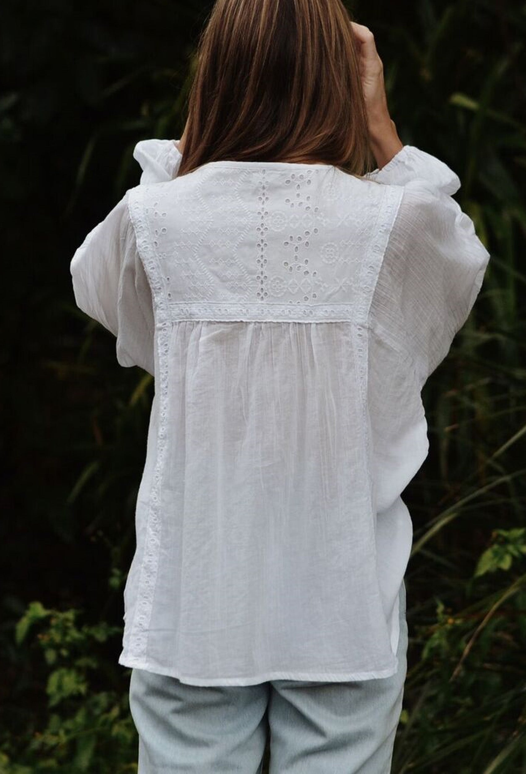 100% Cotton. The ultimate bohemian luxe blouse, this beauty will be a wardrobe staple. Beautifully flowy with billowing sleeves, wear loose or tucked in to add shape. Made in the super soft cotton gauze with French inspired lace panelling in an open pinafore style, great if you are breastfeeding. This blouse is just as perfect for playing on the floor with children as it is for lunch with the girls.