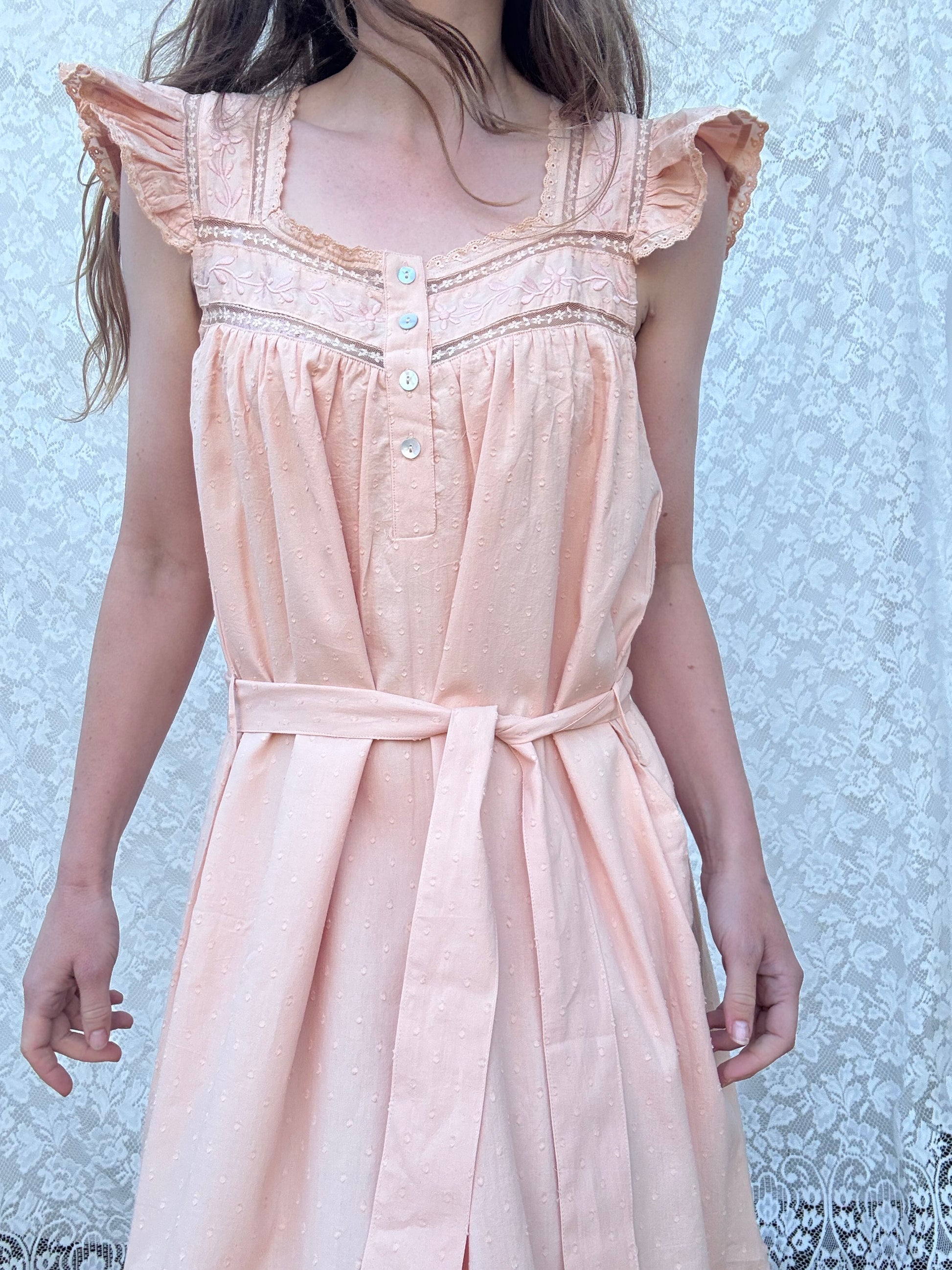 Gathered cap sleeves are a feature along with intricate lace detailing and embroidery which is a beautifully slow and time consuming process. Perfectly dreamy for pottering around on warm days, out to lunch or even for sleep.
