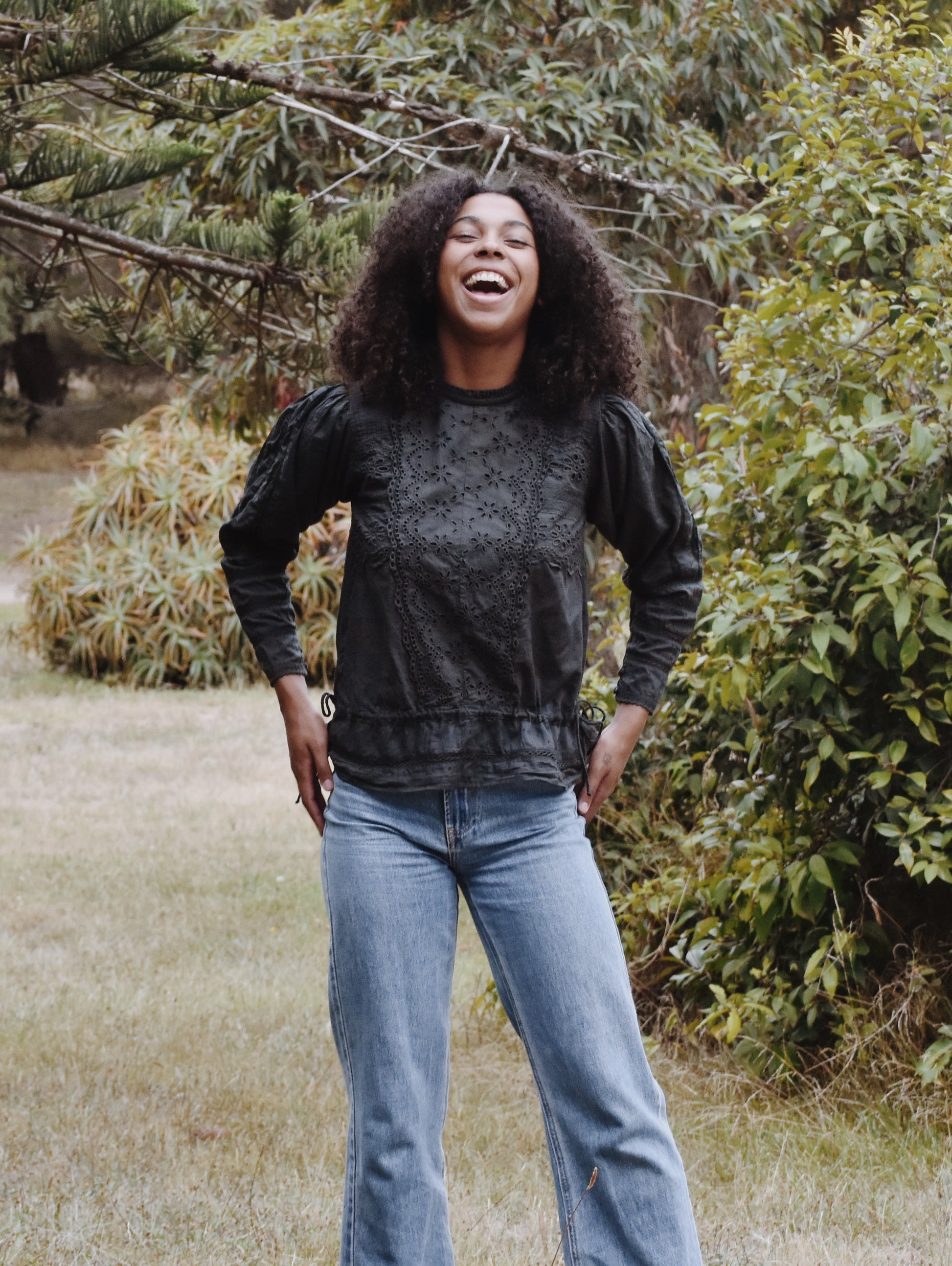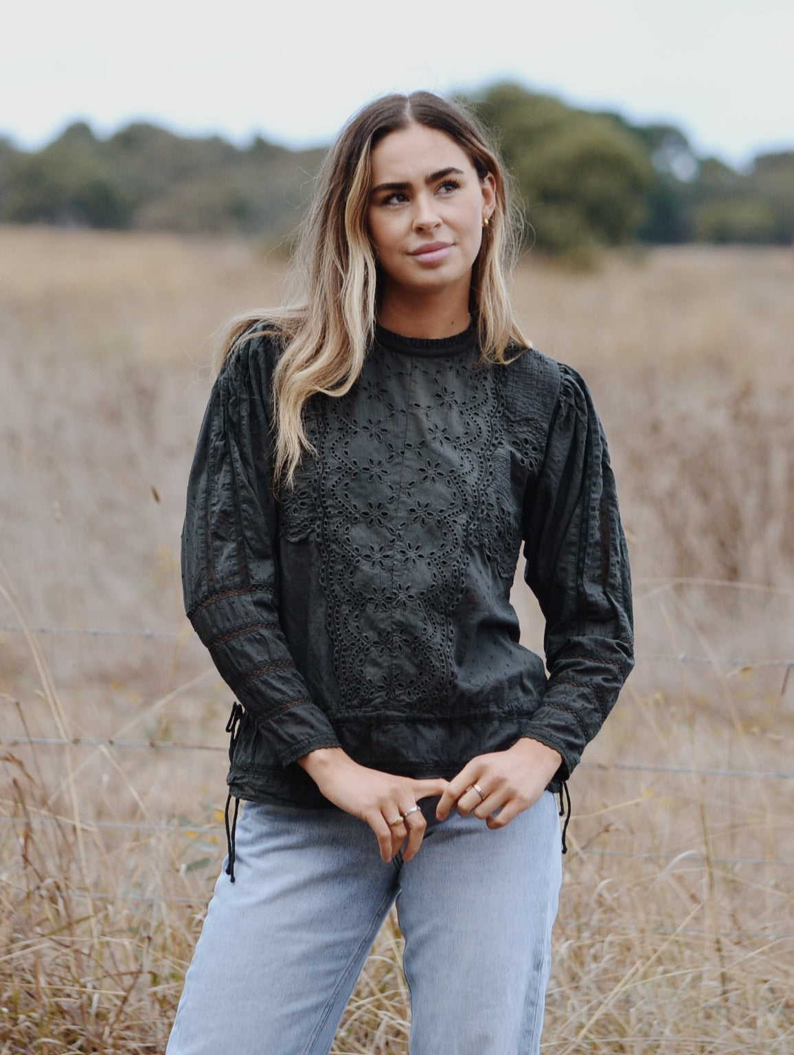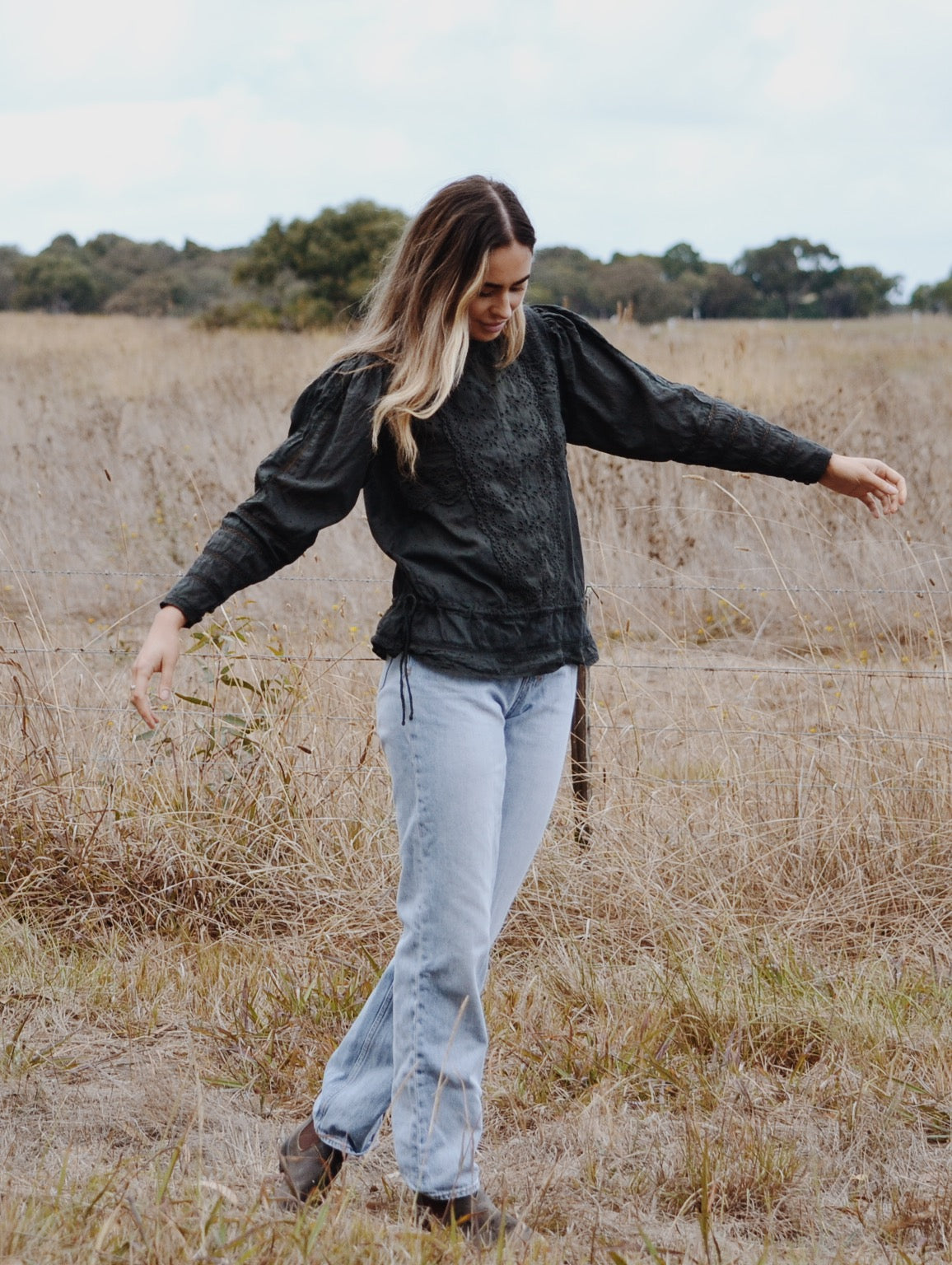 100% cotton. The dreamiest blouse, made for slow days spent wandering in a reverie. A take on the much loved Edith dress, this beauty will take you to a time and place far away. Little nods to nostalgia include the Edwardian inspired high neckline with gathers, lace and pin tuck trim detailing alongside beautifully soft detailed full length sleeves.