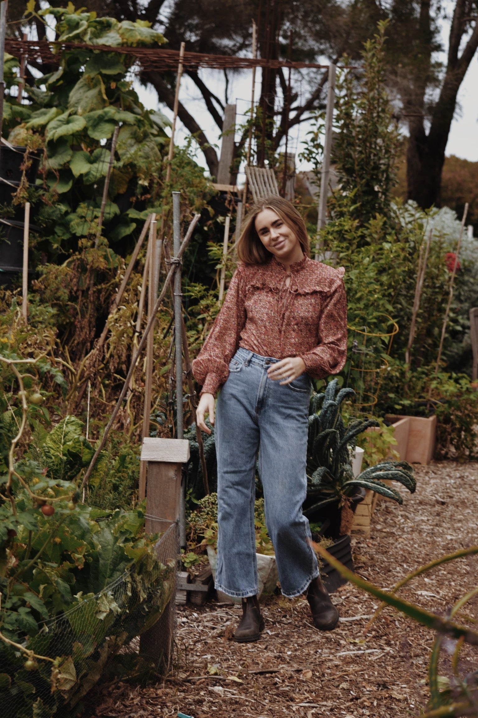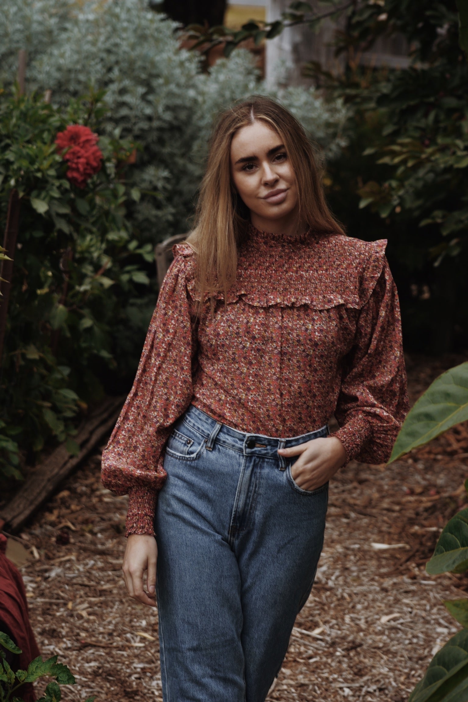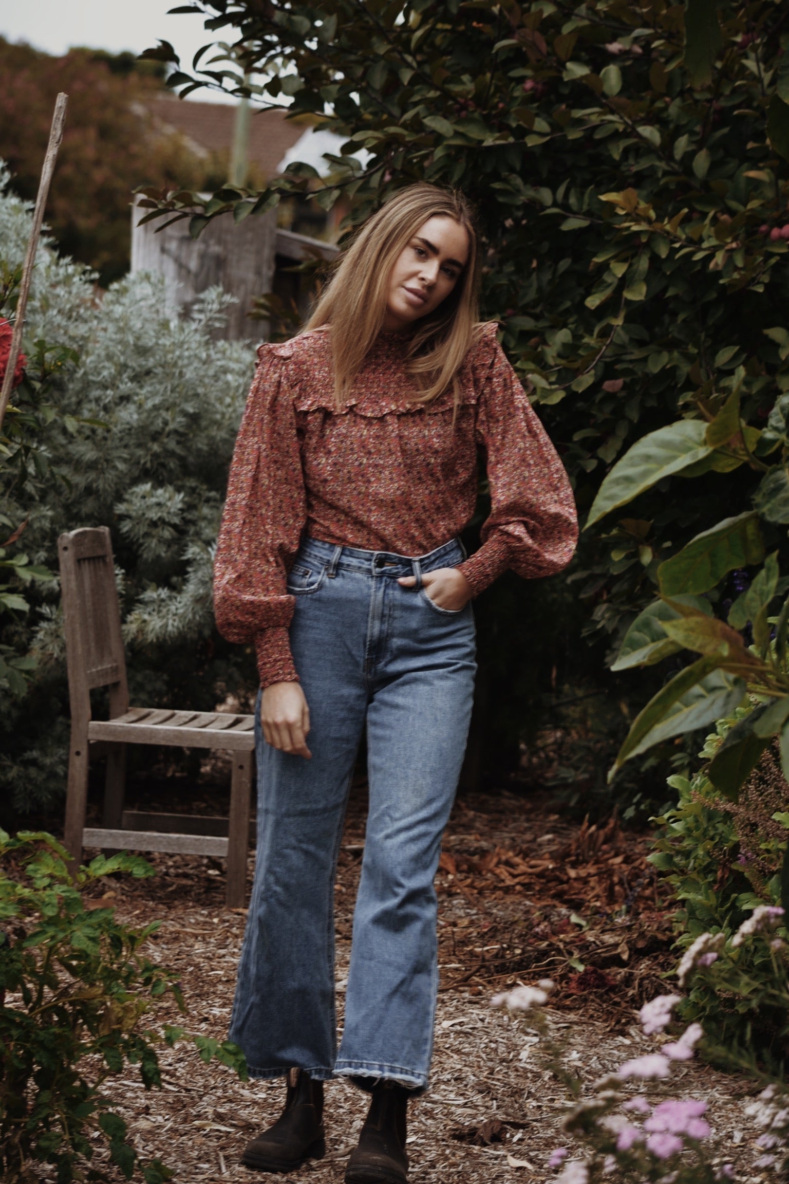 100% cotton. A blouse made for light and carefree days spent slowly outside in the garden. Modernised Edwardian, a beautifully floaty style that can be worn casually with your favourite jeans, or also has a slightly dressier edge in it's frill detailing. The shirred yoke can be worn open casually or as a high neck, making it also ideal for feeding. To get the ultimate wear out of your blouse, you can also flip in around to a closed high neck look too as seen in photos.