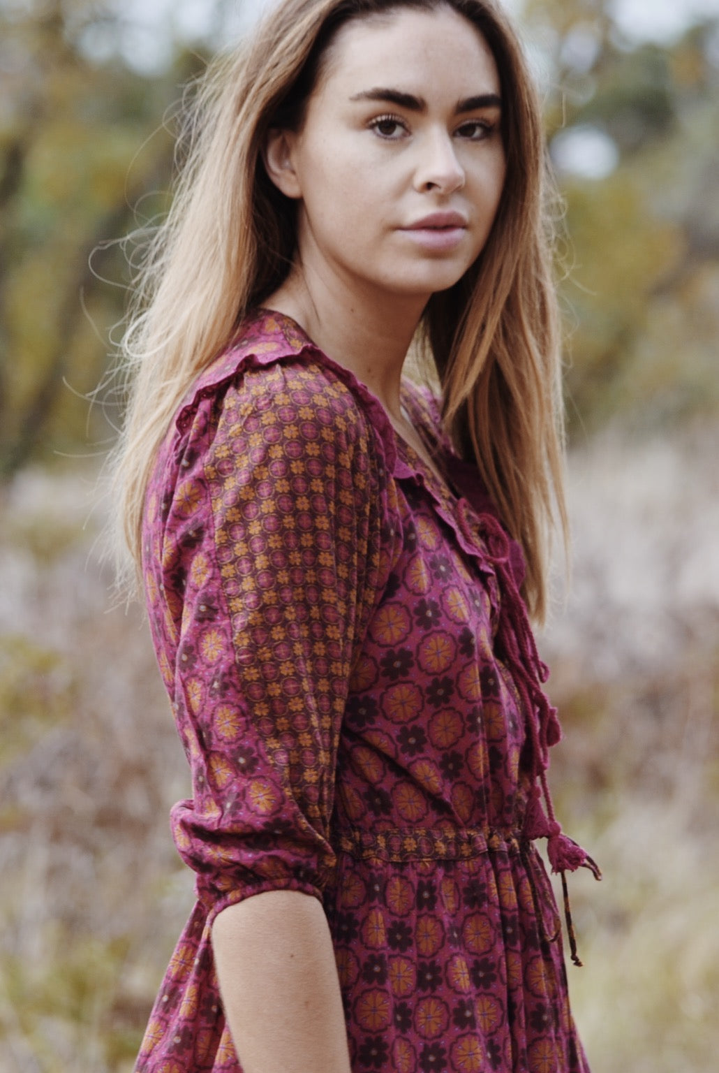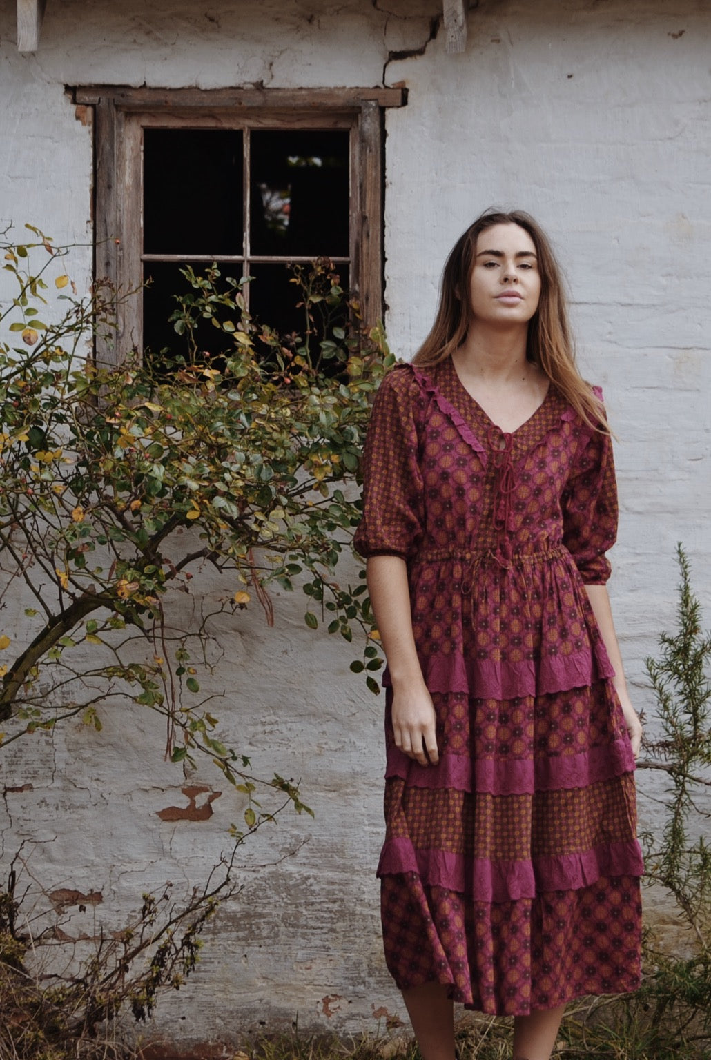 100% cotton. The perfect combination of English country meets bohemian beauty, this style will be your excuse to run through paddocks and laze underneath big old oak trees day dreaming and reading. Beautifully soft and feminine with cotton lace frill detailing along the neckline as well as along tiered skirting. The cotton tassel tie front makes for easy breast feeding followed by a self tie waist which can be cinched to your liking, flowing through to a figure flattering flowing skirt.