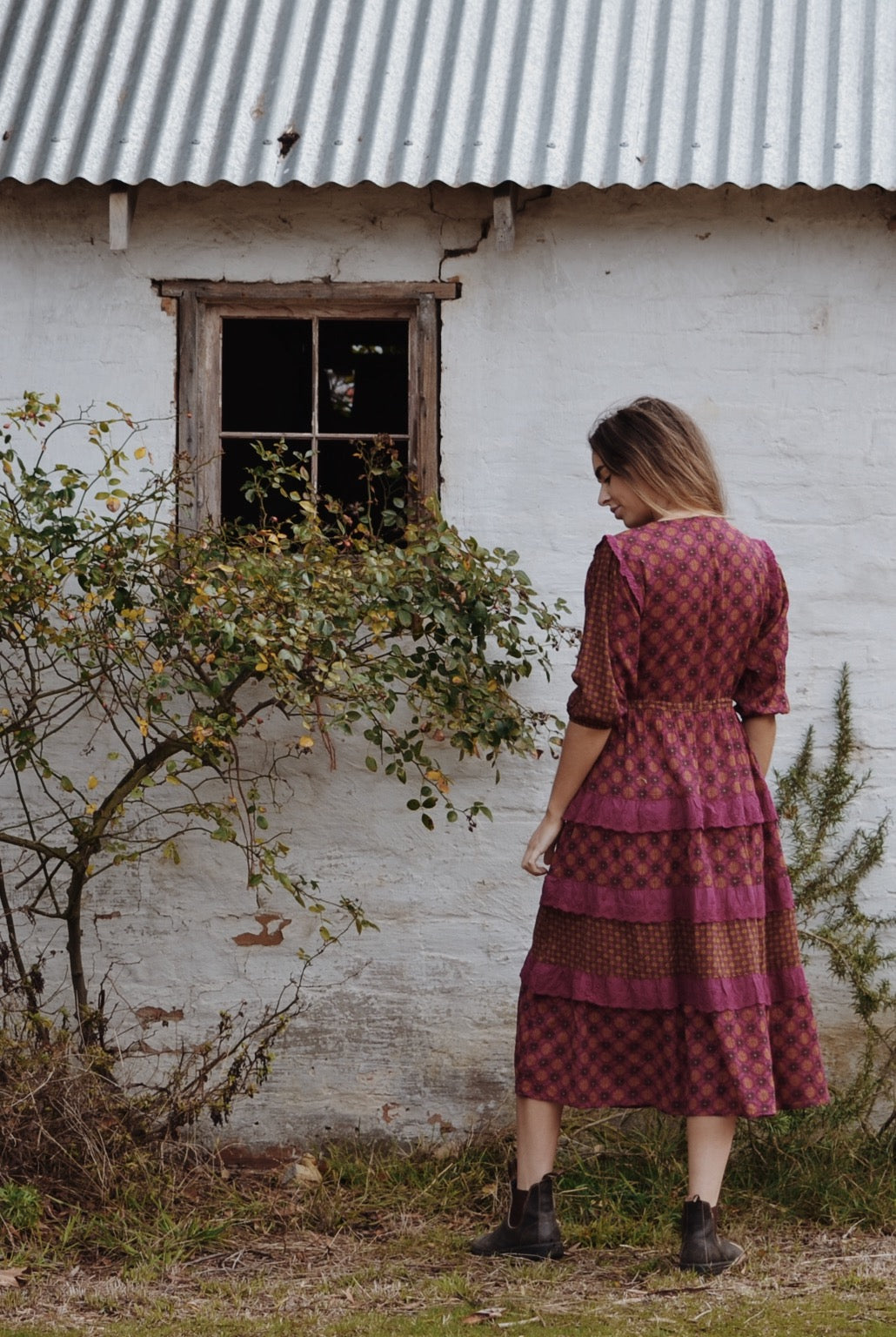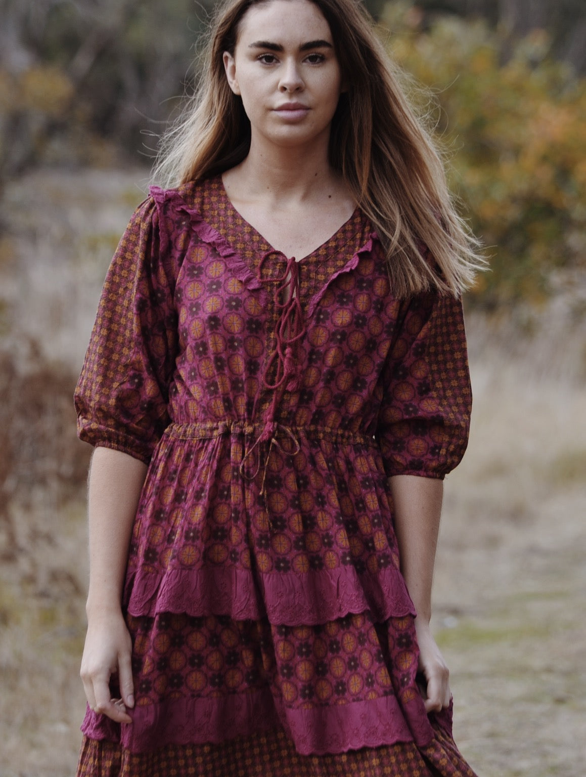 THEA PLUM & MUSTARD FLORAL GEOMETRIC PRINT DRESS