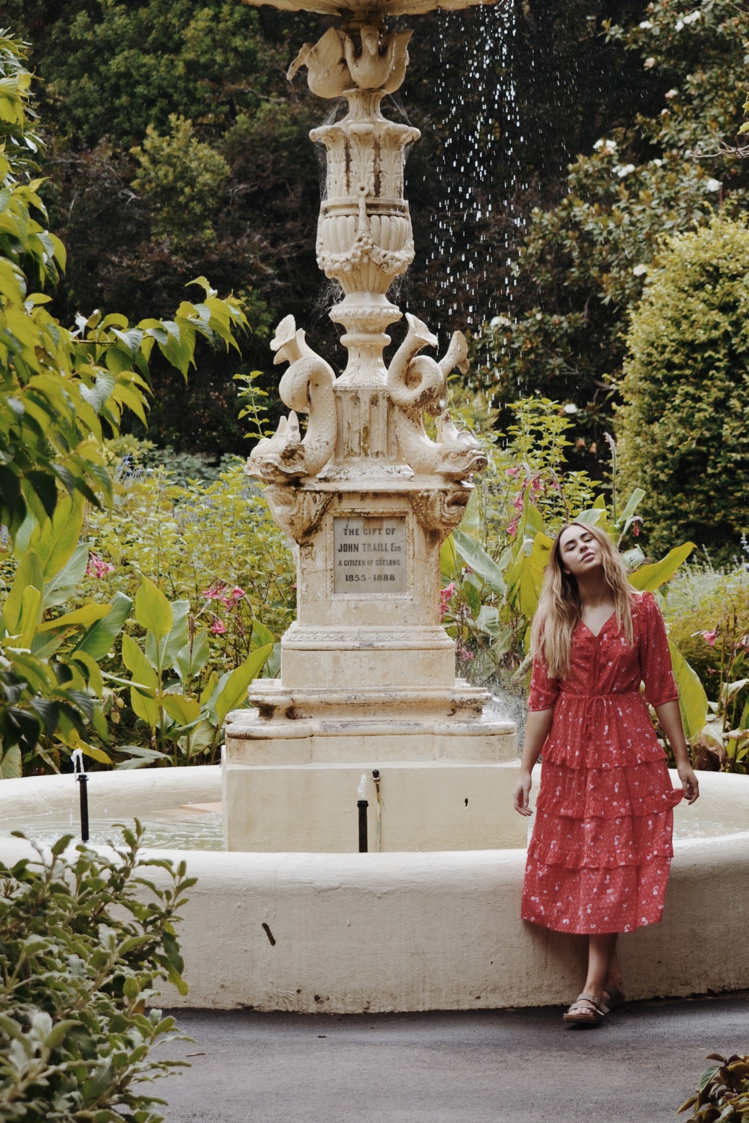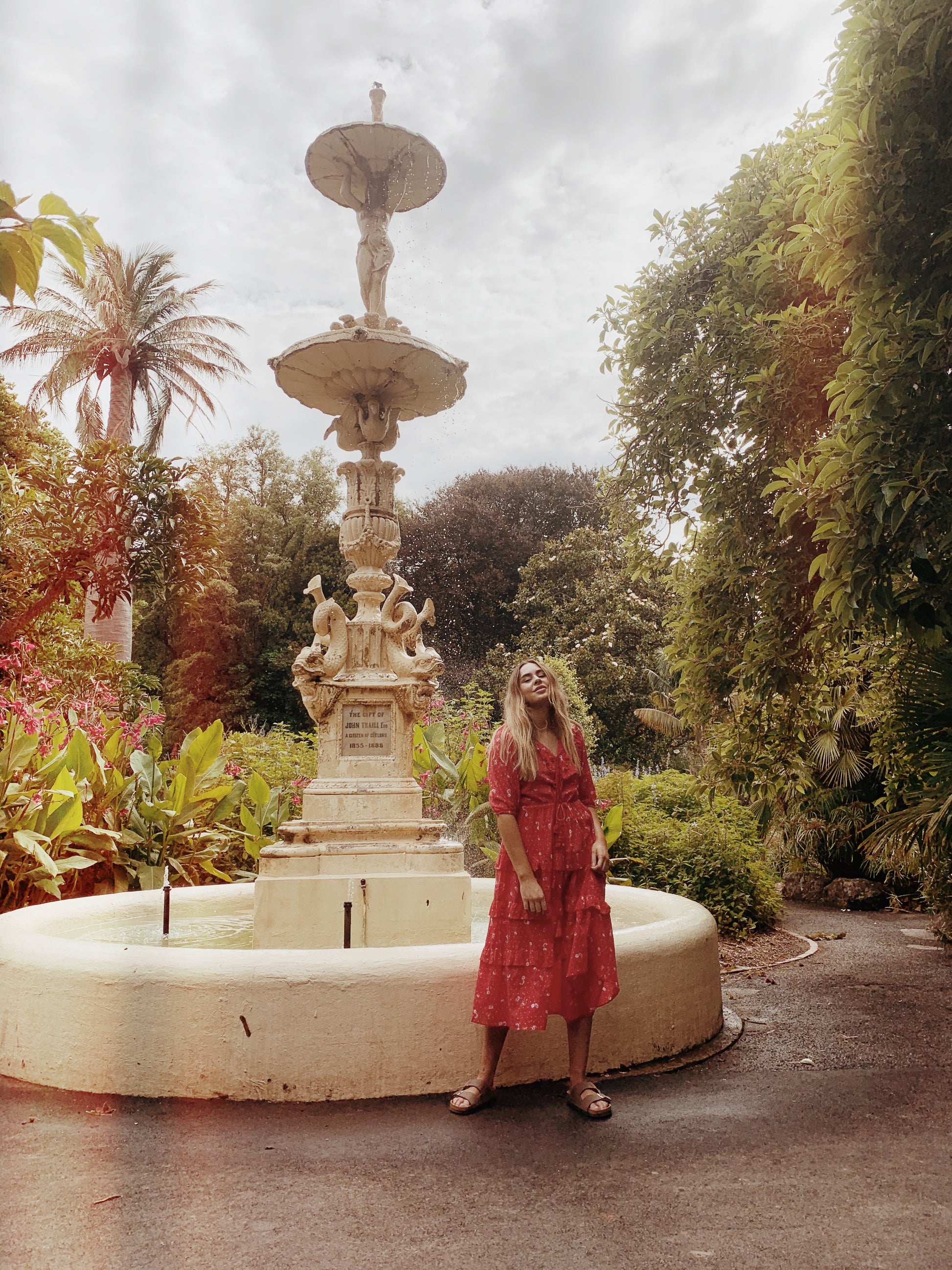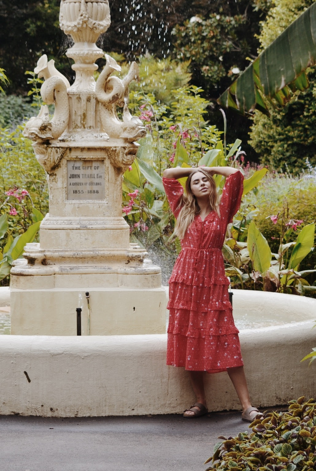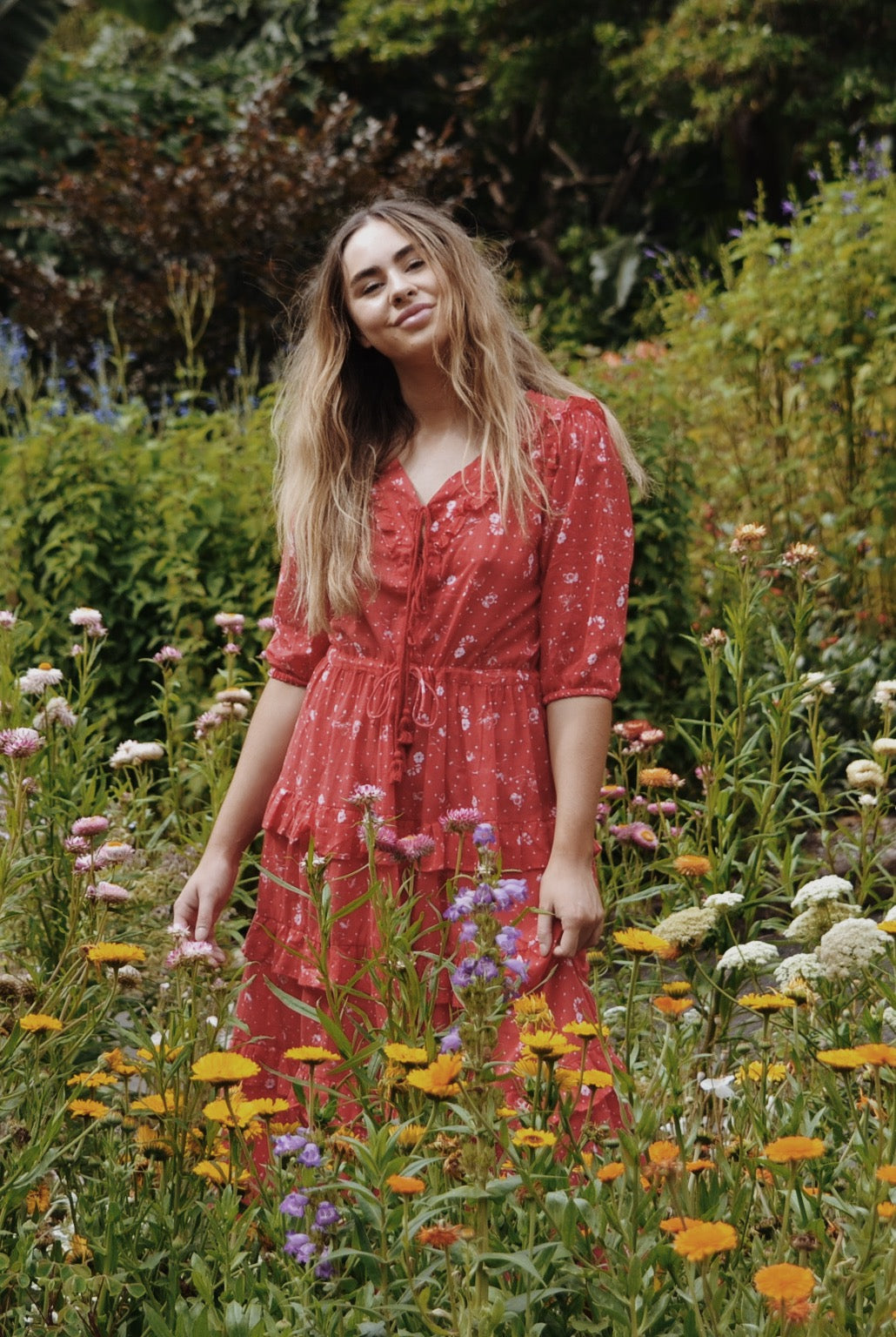 100% cotton. The perfect combination of Mediterranean goddess meets bohemian beauty, this style will be your excuse to run through paddocks and laze underneath big old oak trees day dreaming and reading. Beautifully soft and feminine with frill detailing along the neckline as well as along tiered skirting. The cotton tassel tie front makes for easy breast feeding followed by a self tie waist which can be cinched to your liking, flowing through to a figure flattering, loose skirt. Made in a custom cosmos floral print.